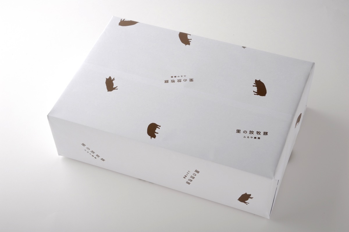 ふるや農園の放牧豚は、里山を自由に駆け回りストレスとは無縁。ブランド「里の放牧豚」のマークはそんな放牧豚の生き生きとした画像を選んで、豚のシルエットをロゴマークに配置。ツートンカラーのムダなものをなくシンプルに徹底したブランドマークとしました。