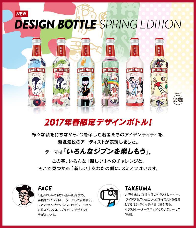 アルコールブランド「SMIRNOFF」からスプリングデザインボトルが登場。「いろんなジブンを楽しむ」をテーマに、人気イラストレーター「FACE」、「STUDIO-TAKEUMA」がデザインした6種類のボトルが発売しております。