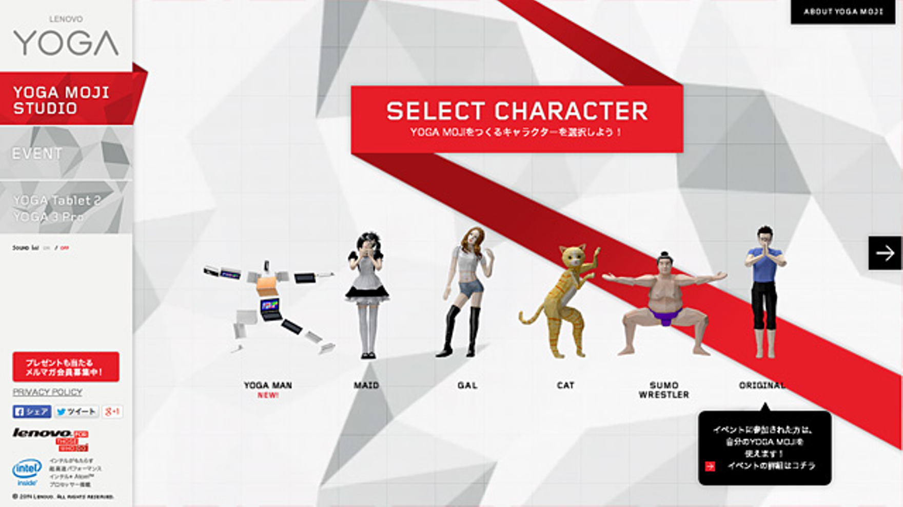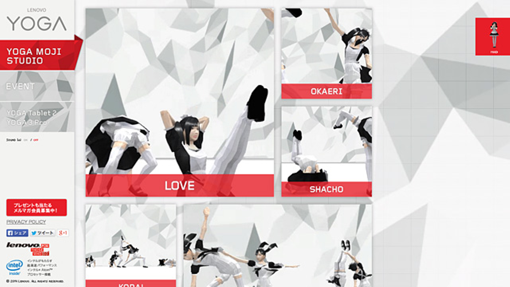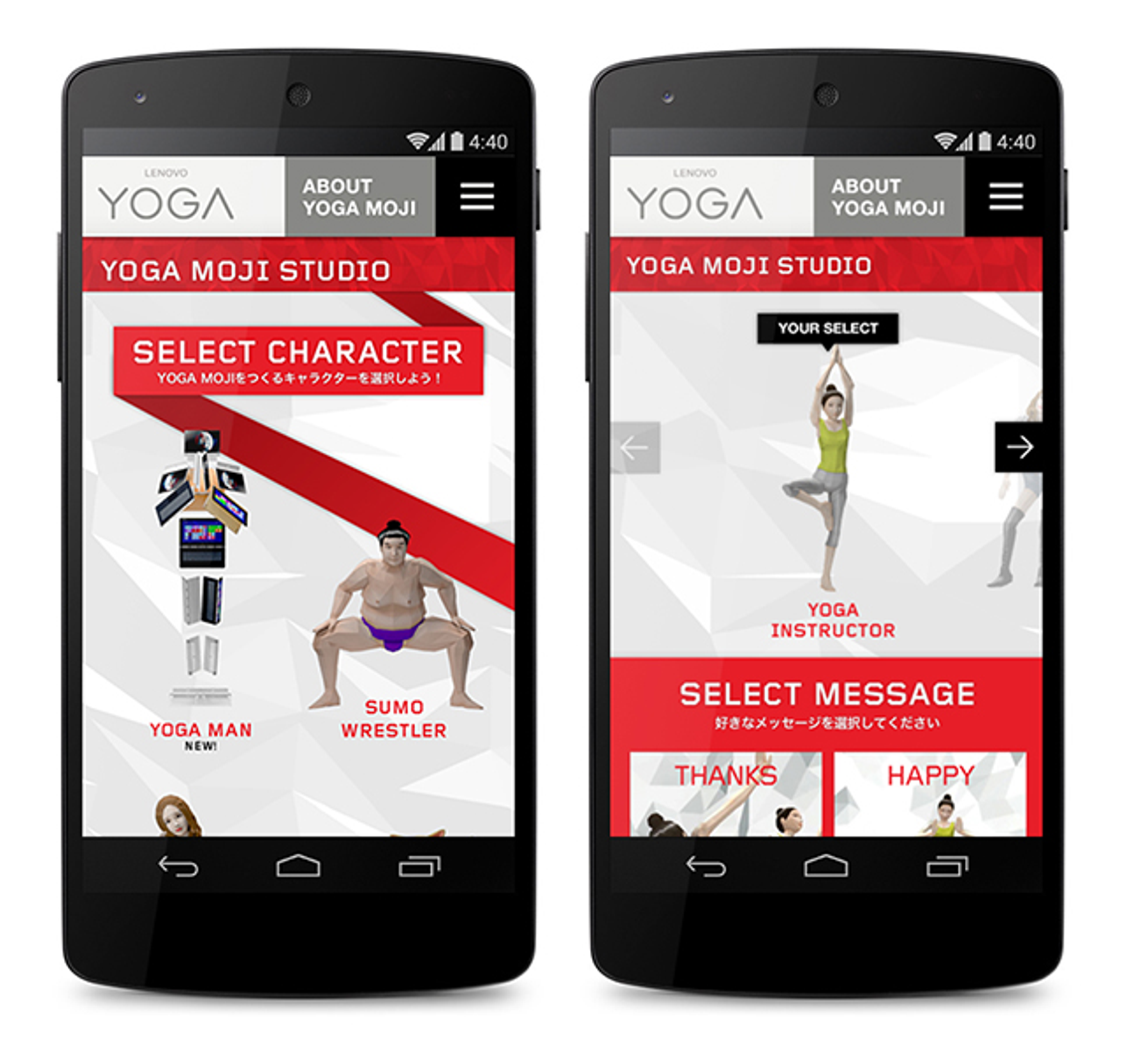 その特長をシンプルに訴求すべく、ヨガの滑らかな動きで作られた文字 "YOGA MOJI" で会話を楽しむツール "YOGA MOJI STUDIO" をリリースしました。12種類もの3Dキャラクターが織りなす、美しくしなやかなヨガポーズで、相手にメッセージを届けるサービスです。