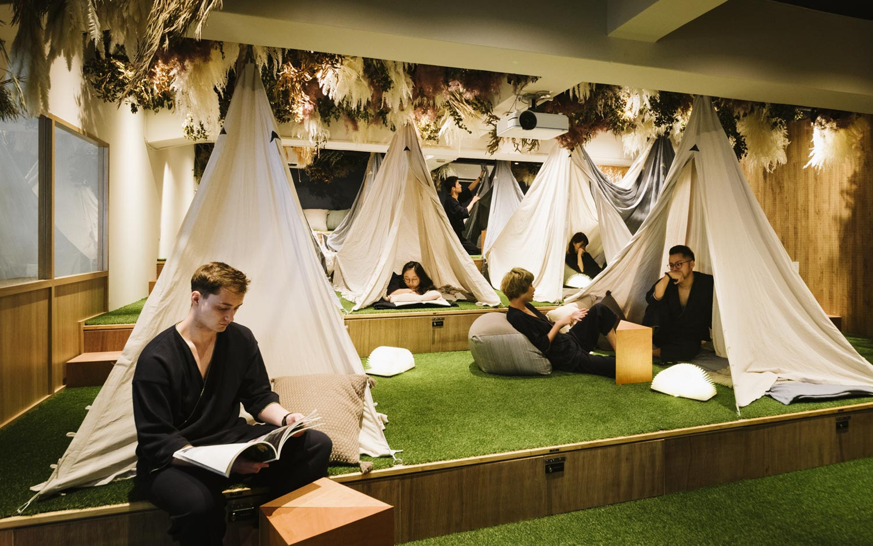 段々畑のような芝のオープンステージに一枚の布と4つのスツールでテントを張り、自分のスペースを確保して寝袋で寝る形式となります。限りなく原始的で、都会の真ん中で気軽にキャンプするような宿泊体験となります。宿泊人数に合わせて布をつなげることで簡単に拡張できるテントとなっていますので、グループや家族で利用することも、1室貸切で利用することも可能です。