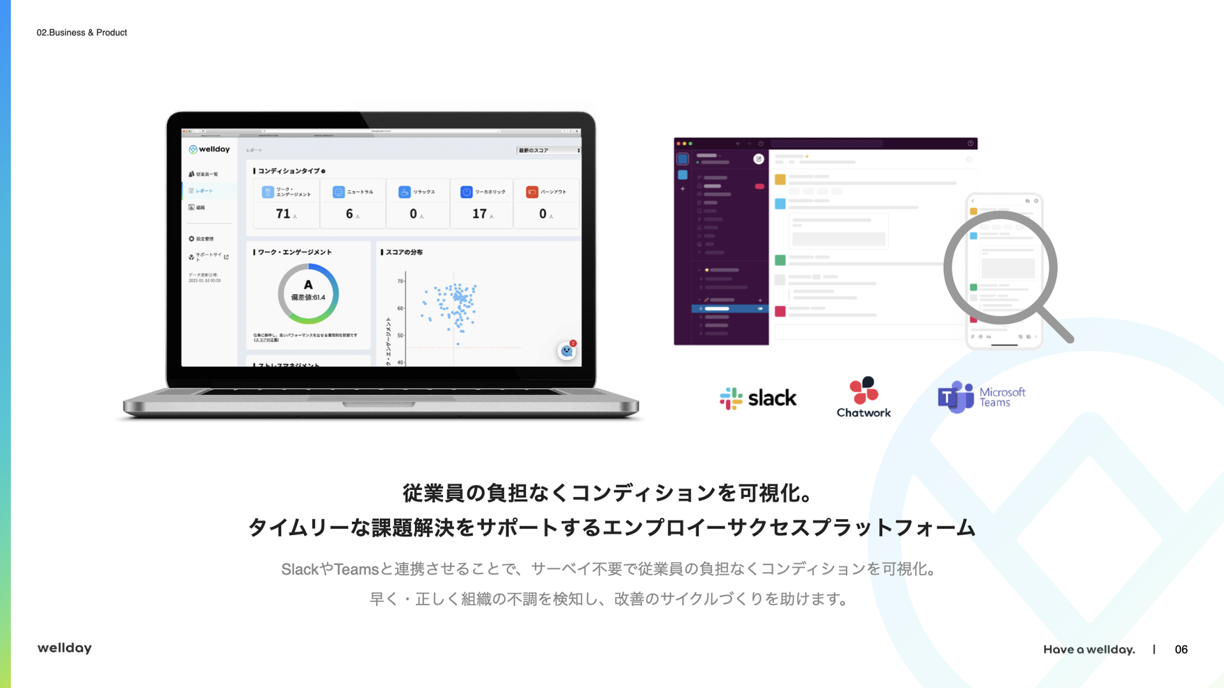 wellday は独自のAI(自然言語処理モデル)で普段日々利用する Slack/Teams 等のコミュニケーションツール上のテキストデータを活用して、無駄なサーベイコストをかけずに、客観的にリアルタイムに従業員コンディションの把握することを実現したクラウドサービスです。