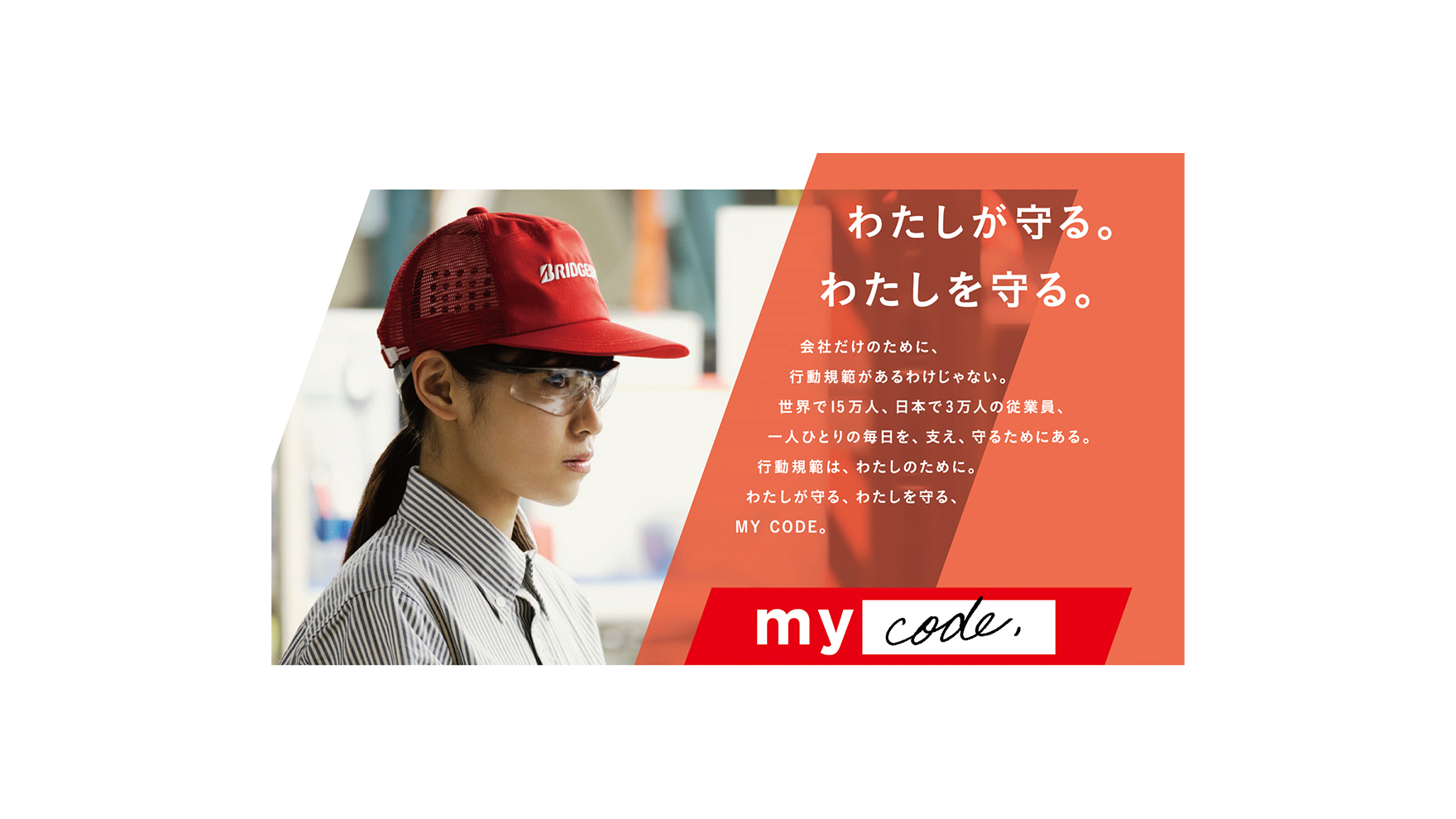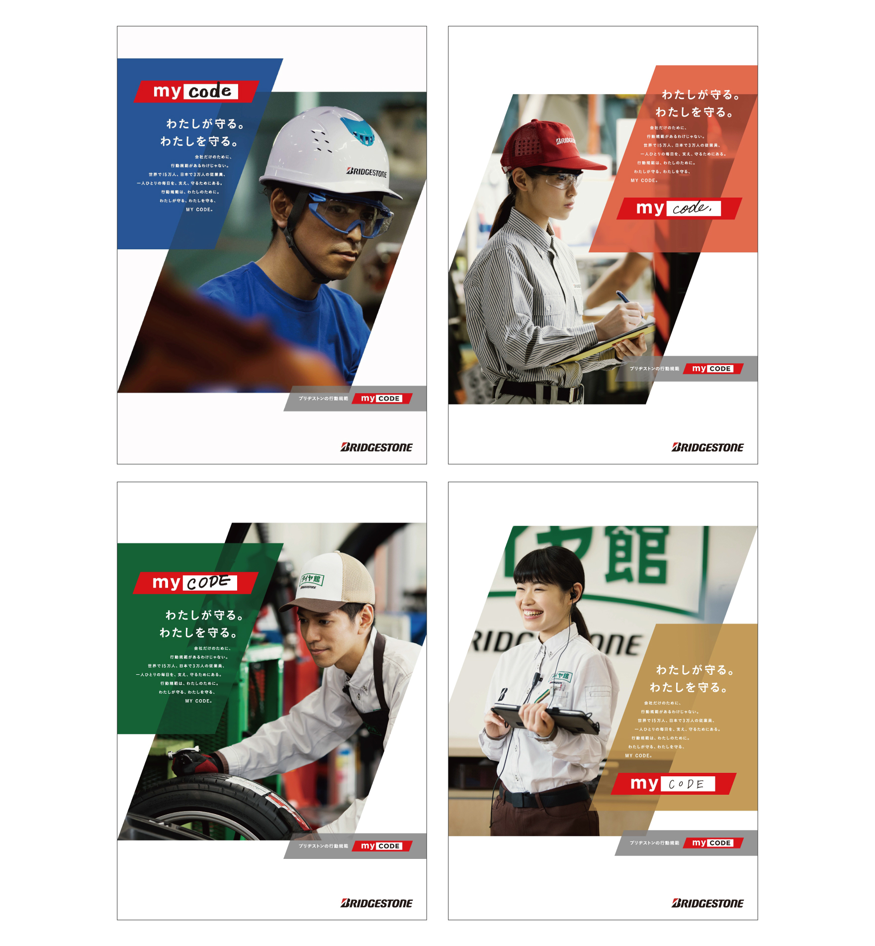 ブリヂストングループが世界共通で策定した「行動規範」を日本国内グループ企業の従業員の皆さんに周知いただく活動です。ブリヂストン独自の「行動規範」であることを明確にし、より身近なものとして受け入れていただくため「行動規範」とその浸透活動に愛称をつけることを提案し採用いただきました。愛称やロゴ、メッセージの開発、ポスター、Eラーニング教材、研修動画などさまざまなツール類も一括して制作しています。