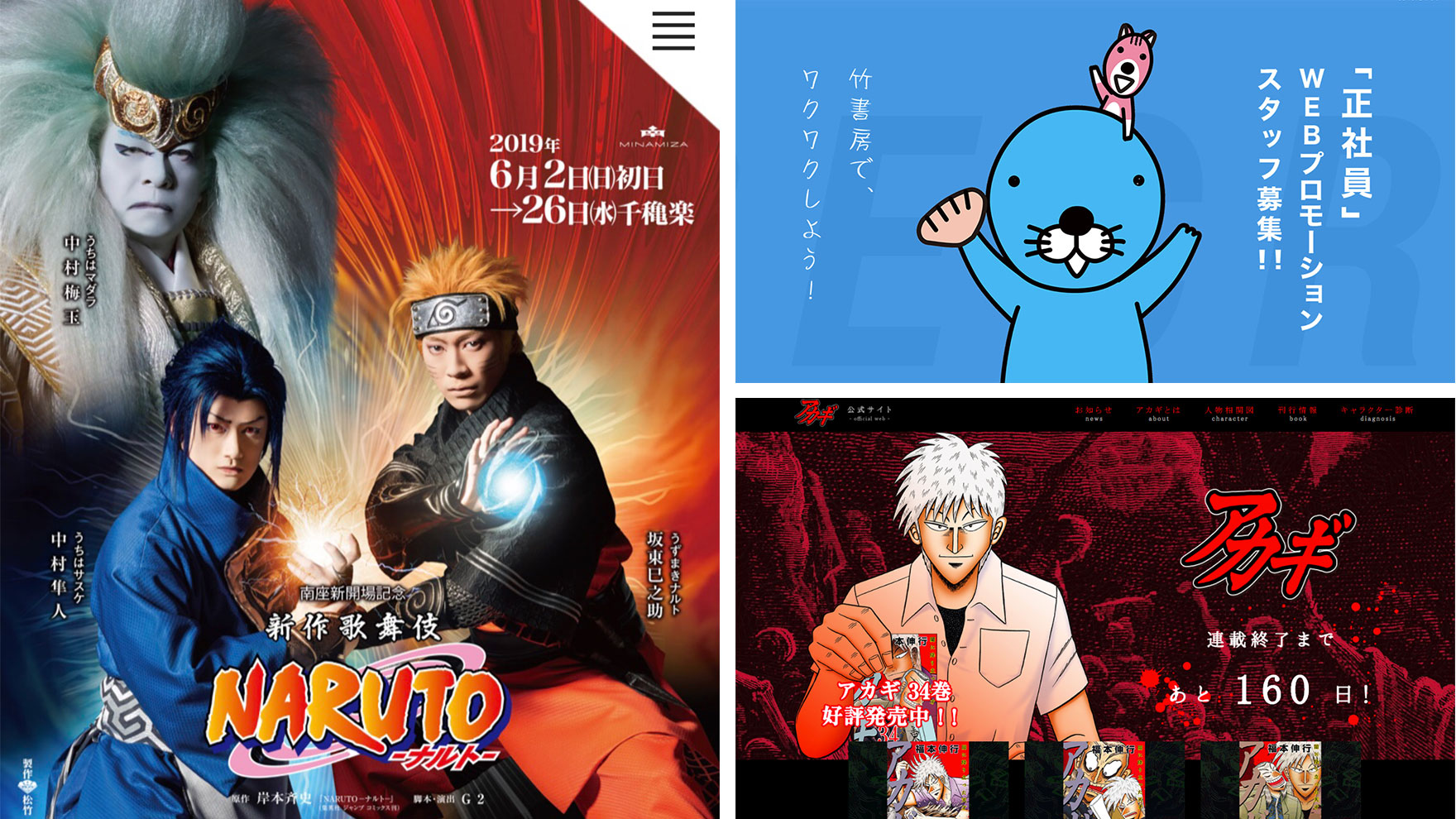 人気漫画「アカギ」をもっと盛り上げるため、「アカギ公式サイト」「アカギキャラクター診断」、「占い」などを企画・制作しました。