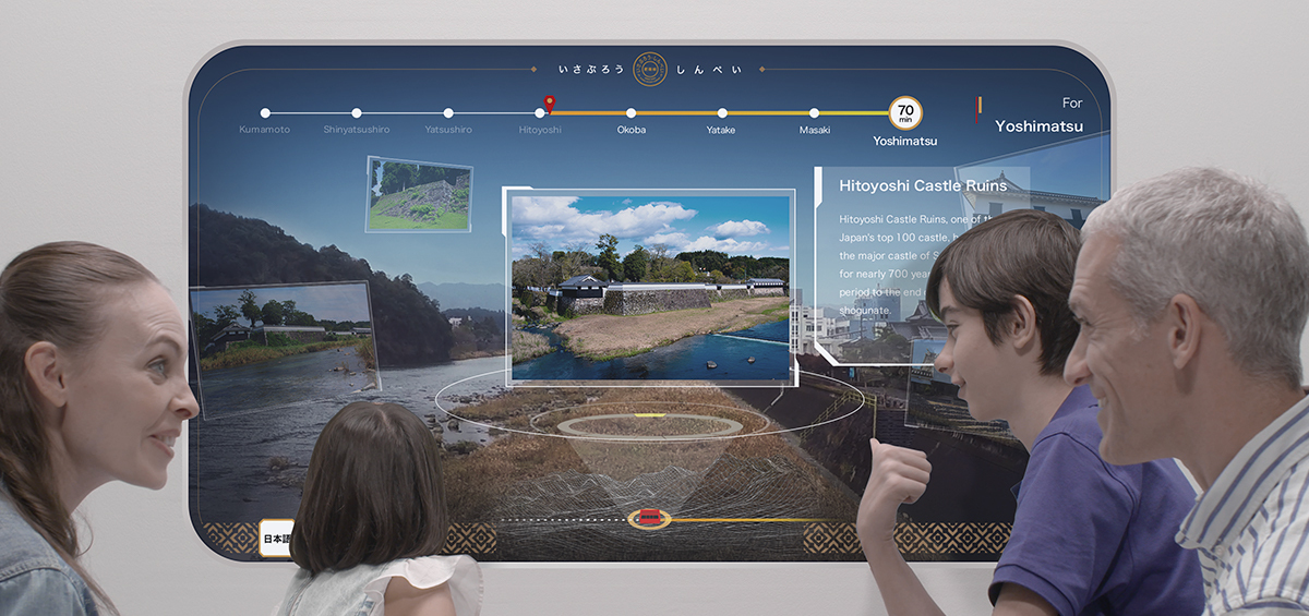 「列車の窓」を新たな情報表示プラットフォームとして活用し、風景に合わせた観光情報をAR技術などにより車窓へリアルタイムに表示したり、タッチや声などの操作で必要な情報をインタラクティブに提供する、新体感観光サービスがめざすイメージを作成いたしました。