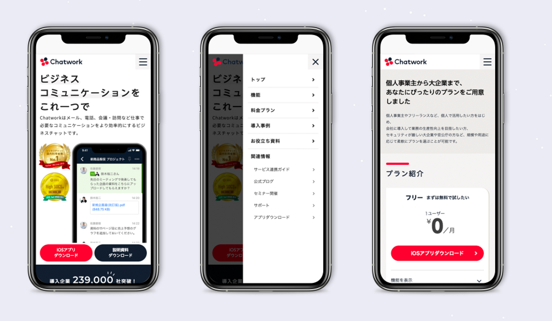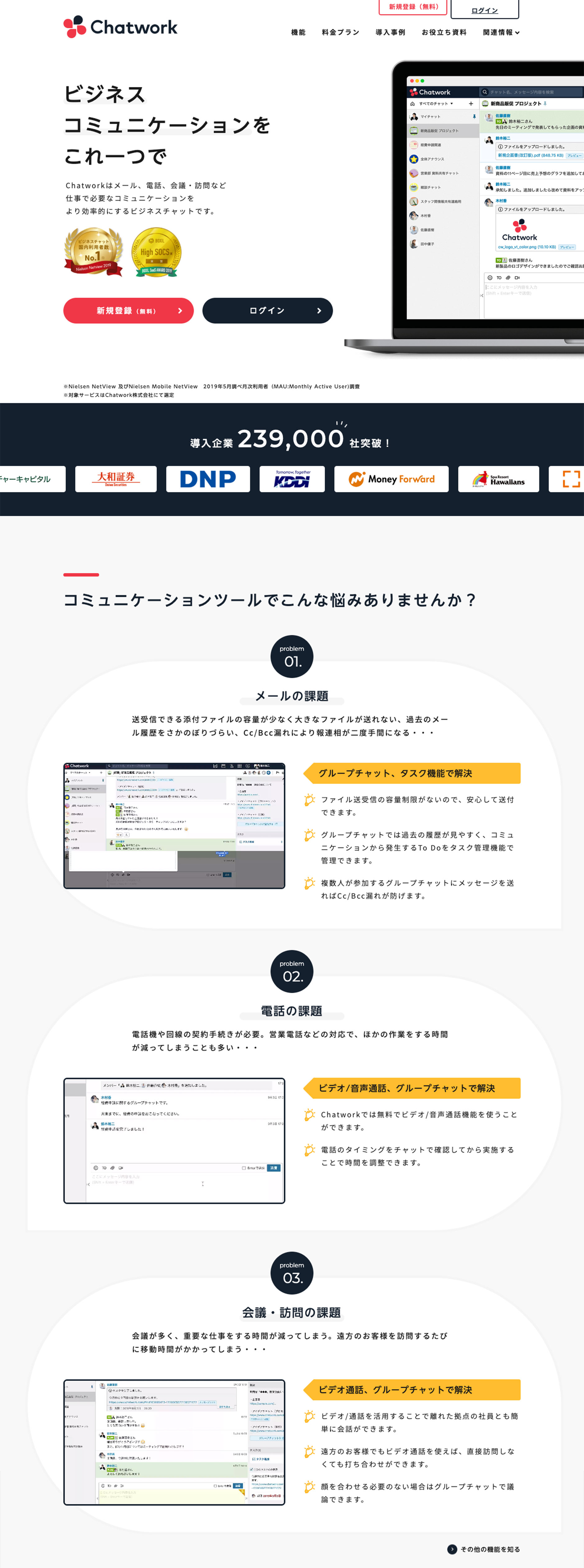 メール、電話、会議・訪問など、仕事で必要なコミュニケーションを効率的にするビジネスチャット、『Chatwork』のサービスサイトをリニューアル制作しました。