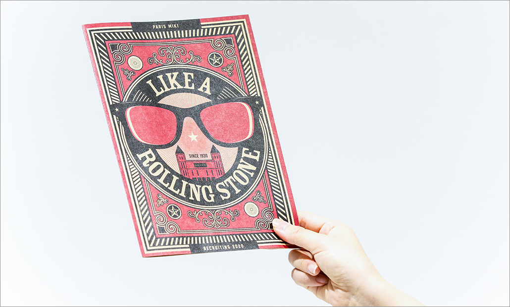 そこで、求める学生とのコンタクトを増やすため、進化する三城の世界観に共感をする学生が思わず手に取りたくなるようなパンフレット制作を提案。新しいアイデアで店舗の展開に挑戦する姿を「Like a Rolling Stone」というコピーで表現し、「変化し続ける眼鏡店」を渋谷店の世界観から「ロックを愛する眼鏡店」として、採用パンフレットのメインコンセプトに据えました。