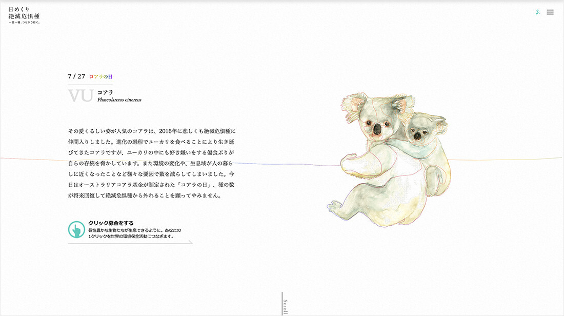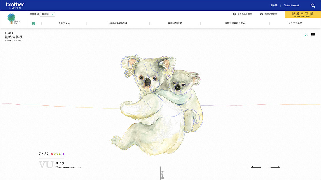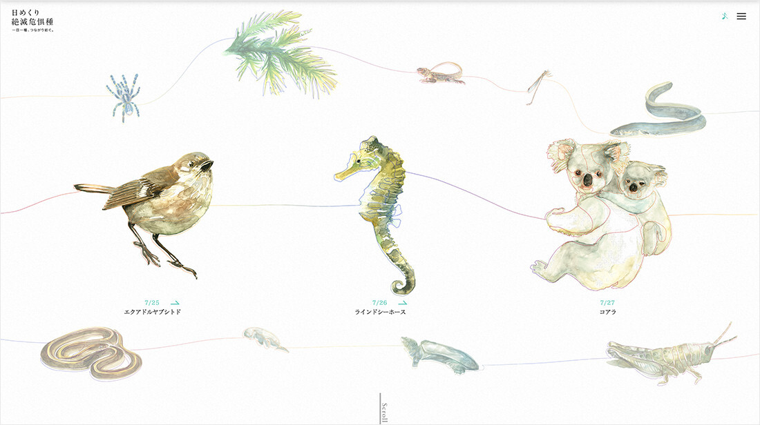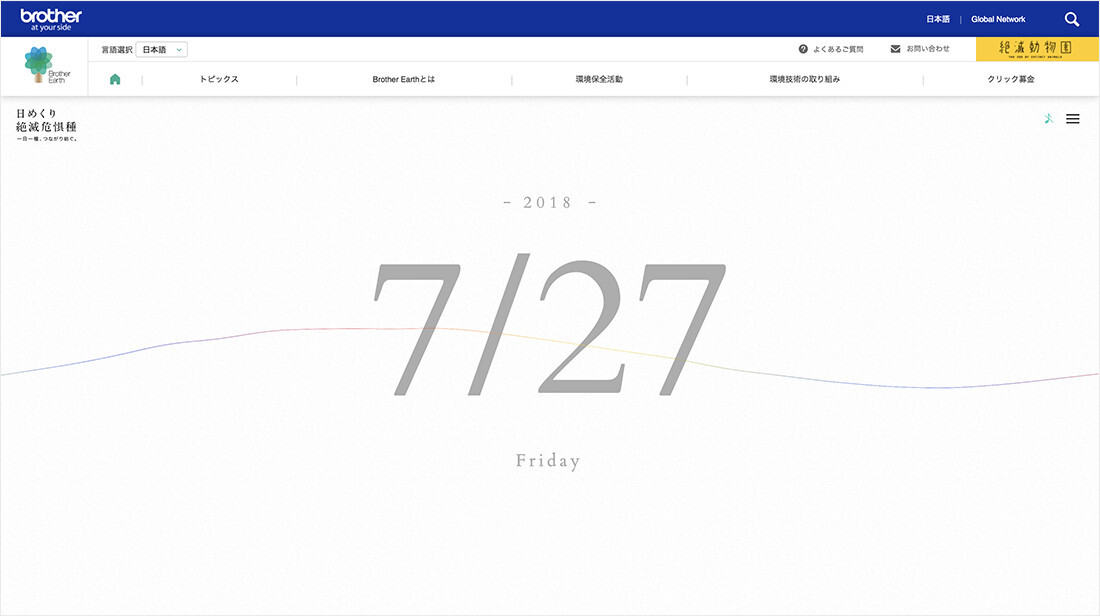 すべての事業活動領域における生態系への影響削減に取り組み、生物多様性保全にも力を入れているブラザー様。その活動の一環として、生物多様性の啓発を目的にスタートしたのが「日めくり絶滅危惧種」です。一本の線画で描かれる生物のつながり。手書きの水彩画による命の彩り。一日一種描かれる絶滅危惧種から、生物の多様性や、そのつながりの大切さと途絶えそうな現実に目を向けるきっかけとなることを目指しています。