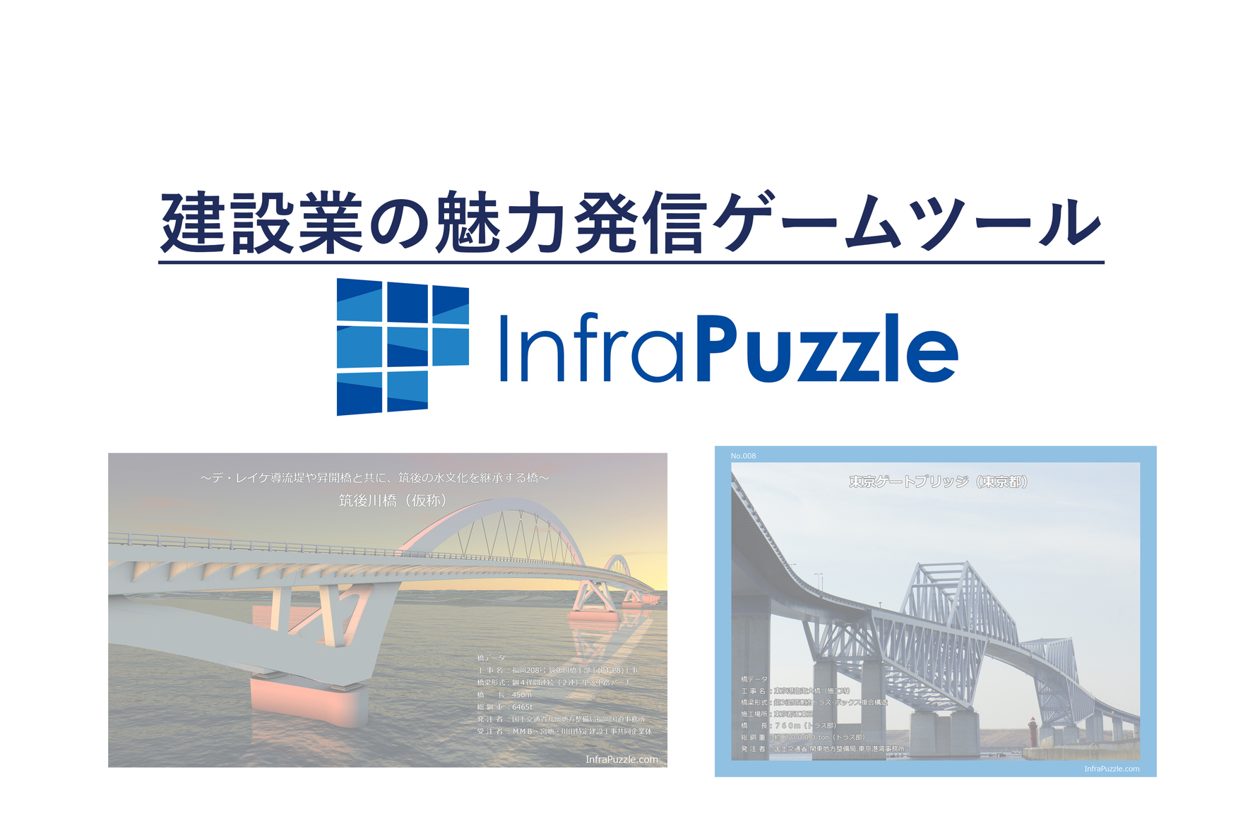 InfraPuzzle(インフラパズル)は、3x3 または4x4のマス目を1つの駒とみなし1駒ぶんの空きを利用して駒をスライドし、駒を目的の配置にする伝統的なパズルゲームがあります。InfraPuzzleは自社施工物件の写真画像等をスライドパズルにして幅広い世代に向けてPRしたい法人向けサービスです。将来の担い手をはじめとする世代に、橋梁建設などの社会インフラ整備事業に魅力を感じてもらいつつ、施工会社および業界全体のイメージアップにも貢献します。