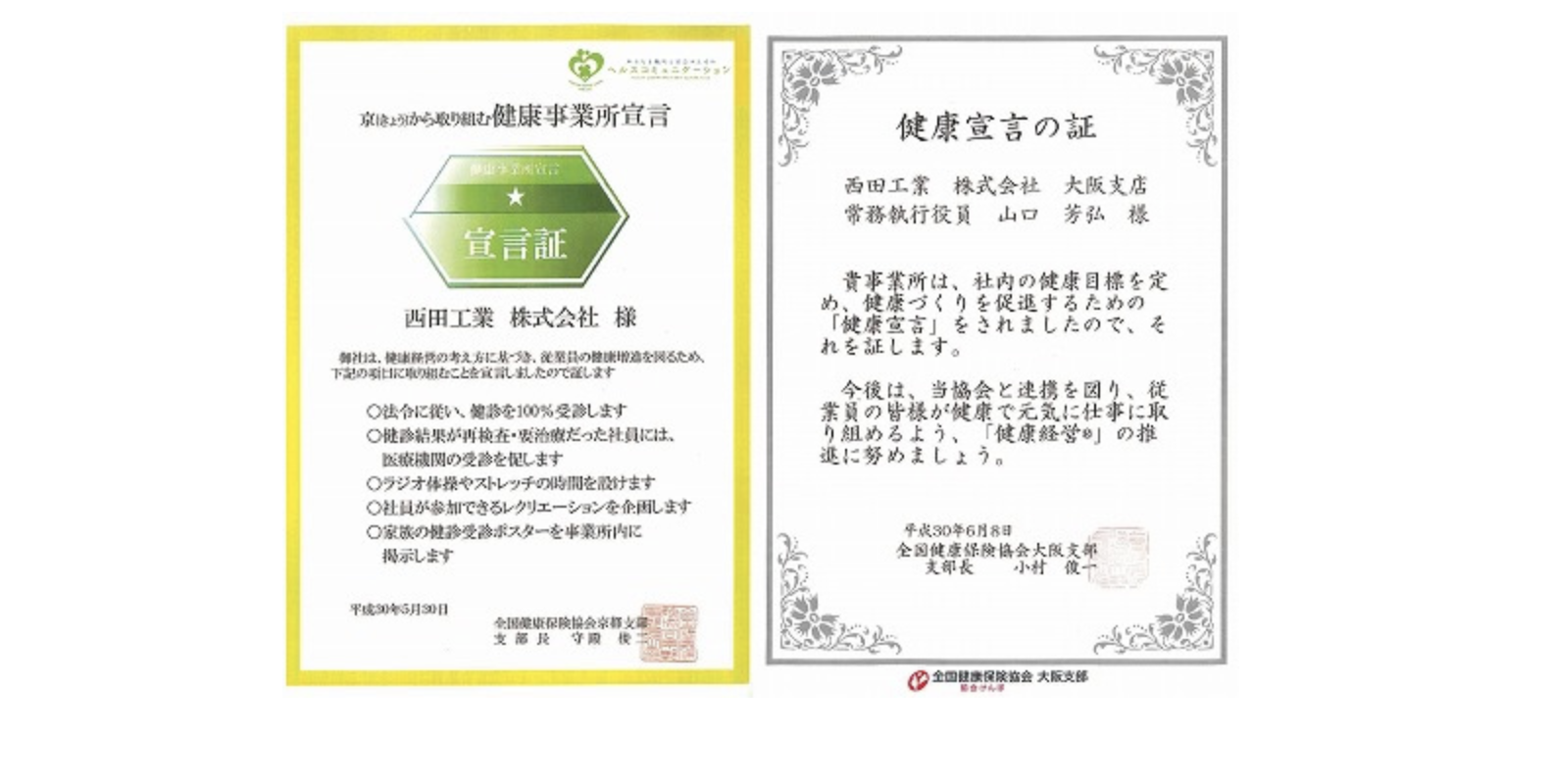この取組みが評価され、福知山本社、大阪本店共に、全国健康保険協会の「健康事業所宣言」に認定されました。