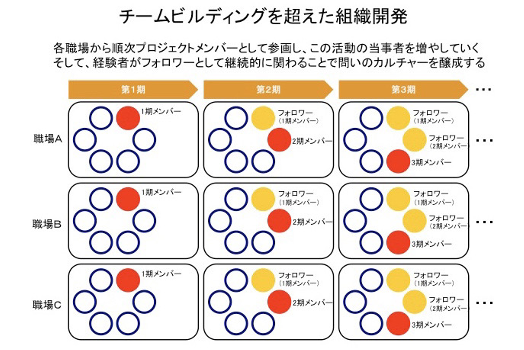 クエスチョンサークルは1期4~6名程度の少人数で行いますが、それを2期、3期…と継続することで組織文化を醸成します。クエスチョンサークル経験者がフォロワーとして関わることで、職場においても問いが機能する関係性が構築されます。