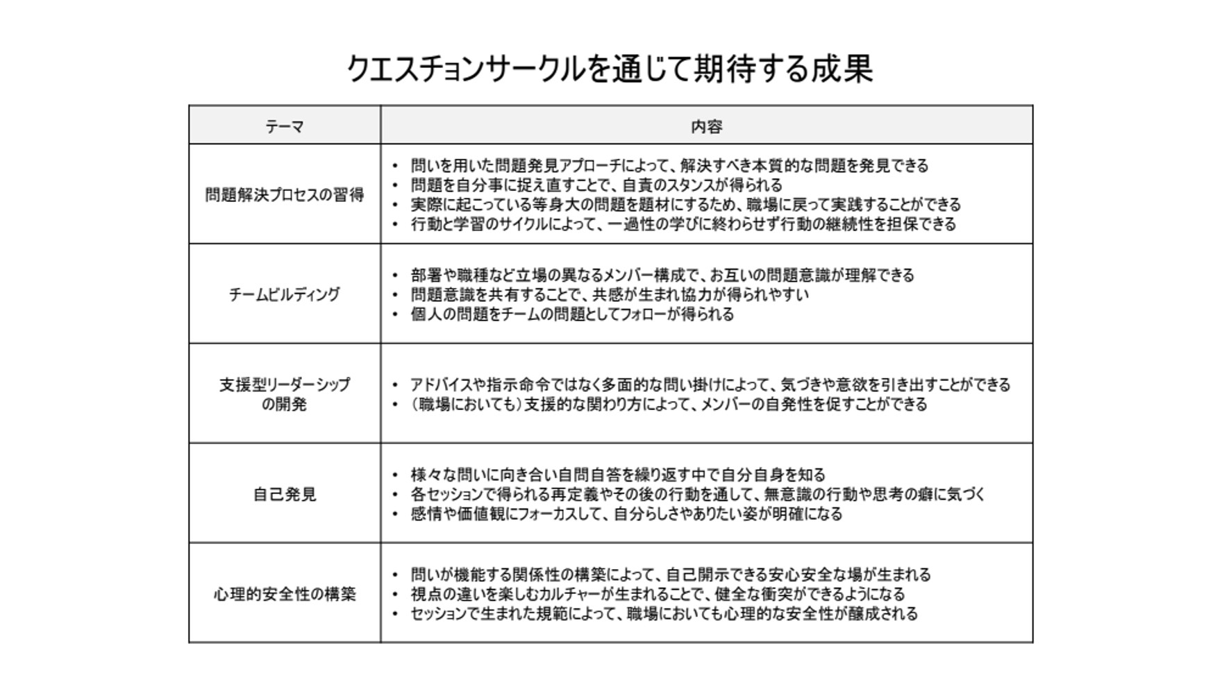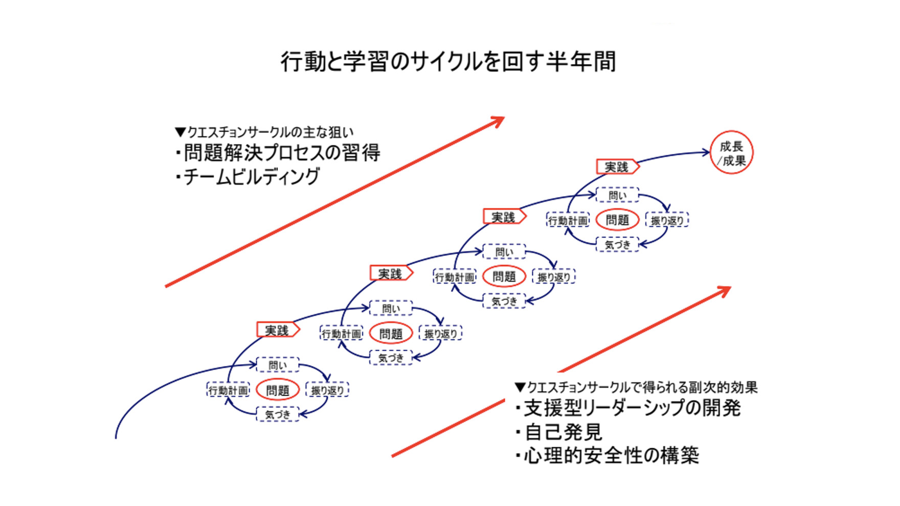 クエスチョンサークルでは、職場で起こっている現実の問題を題材にするため、その後の職場において大きな変化が生まれます。また、行動と学習のサイクルによって、一過性の学びに終わらせず行動の継続性を担保できることが特徴です。