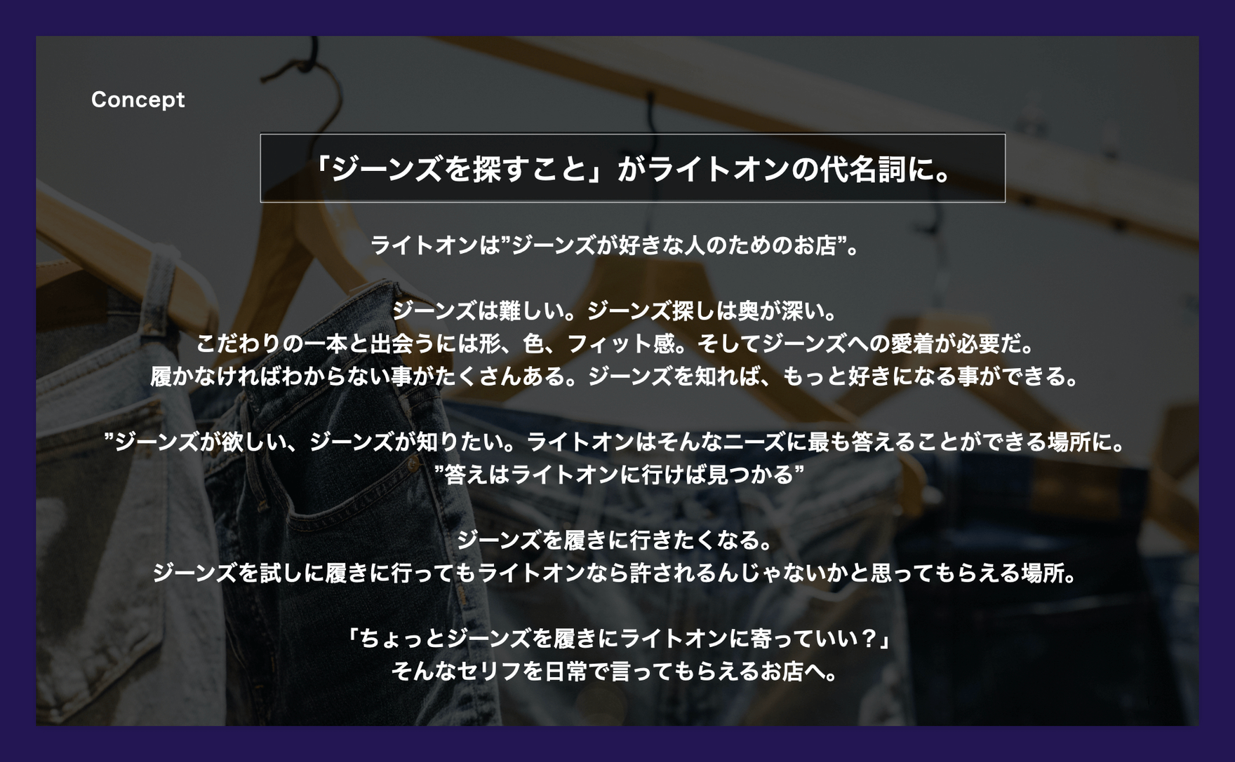 ライトオンは、アメカジのアパレルショップとして最大規模の店舗数を誇るアパレル企業です。ジーンズを中心としたアメカジのセレクトショップになっていくために、改めてライトオンらしさとは?を問い直しました。