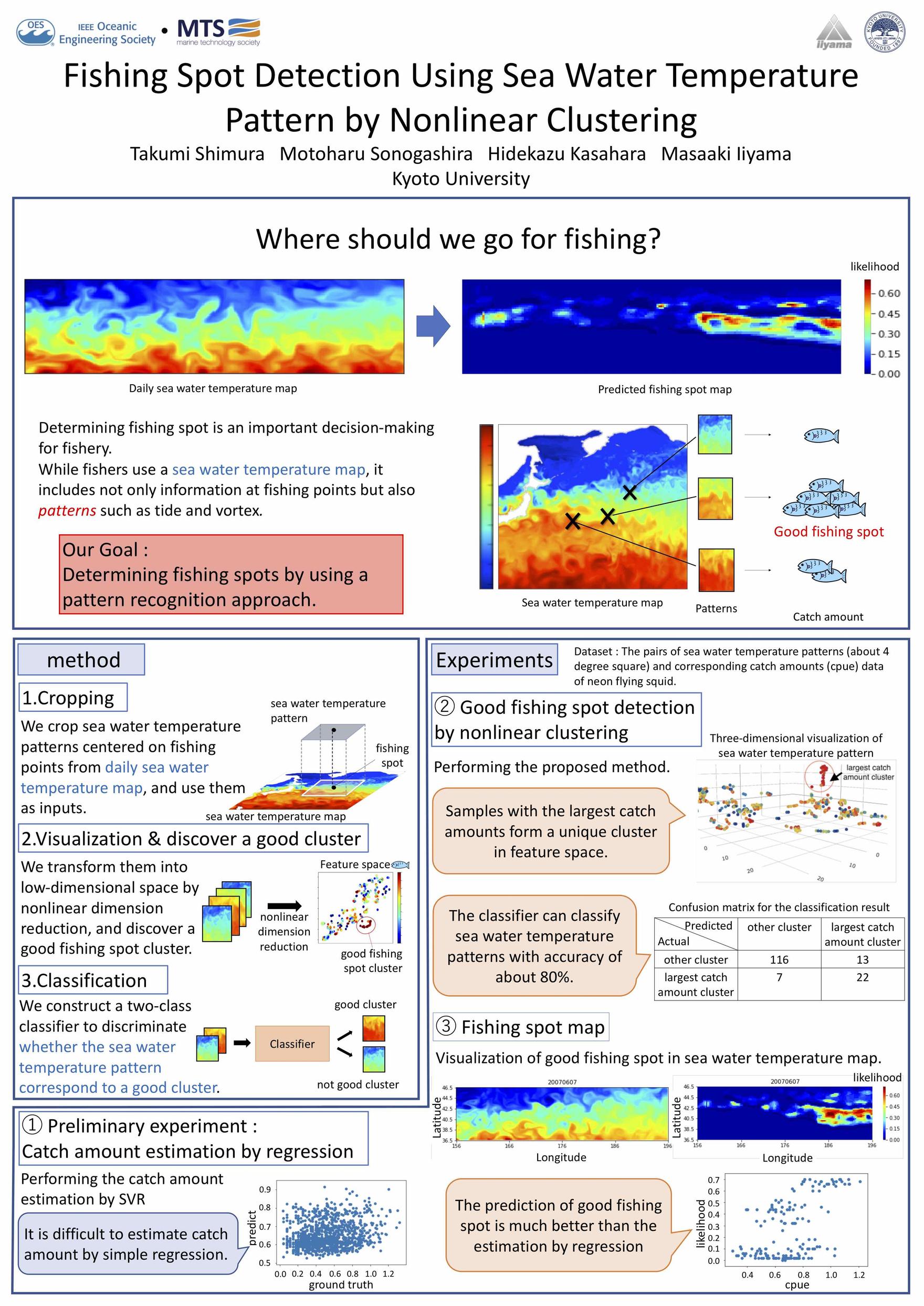 京都大学飯山研究室の志村拓実君が,マルセイユで開催された海洋に関する国際会議Oceans2019 Marseilleにて,”Fishing Spot Detection Using Sea Water Temperature Pattern by Nonlinear Clustering”のタイトルで口頭発表を行いました.