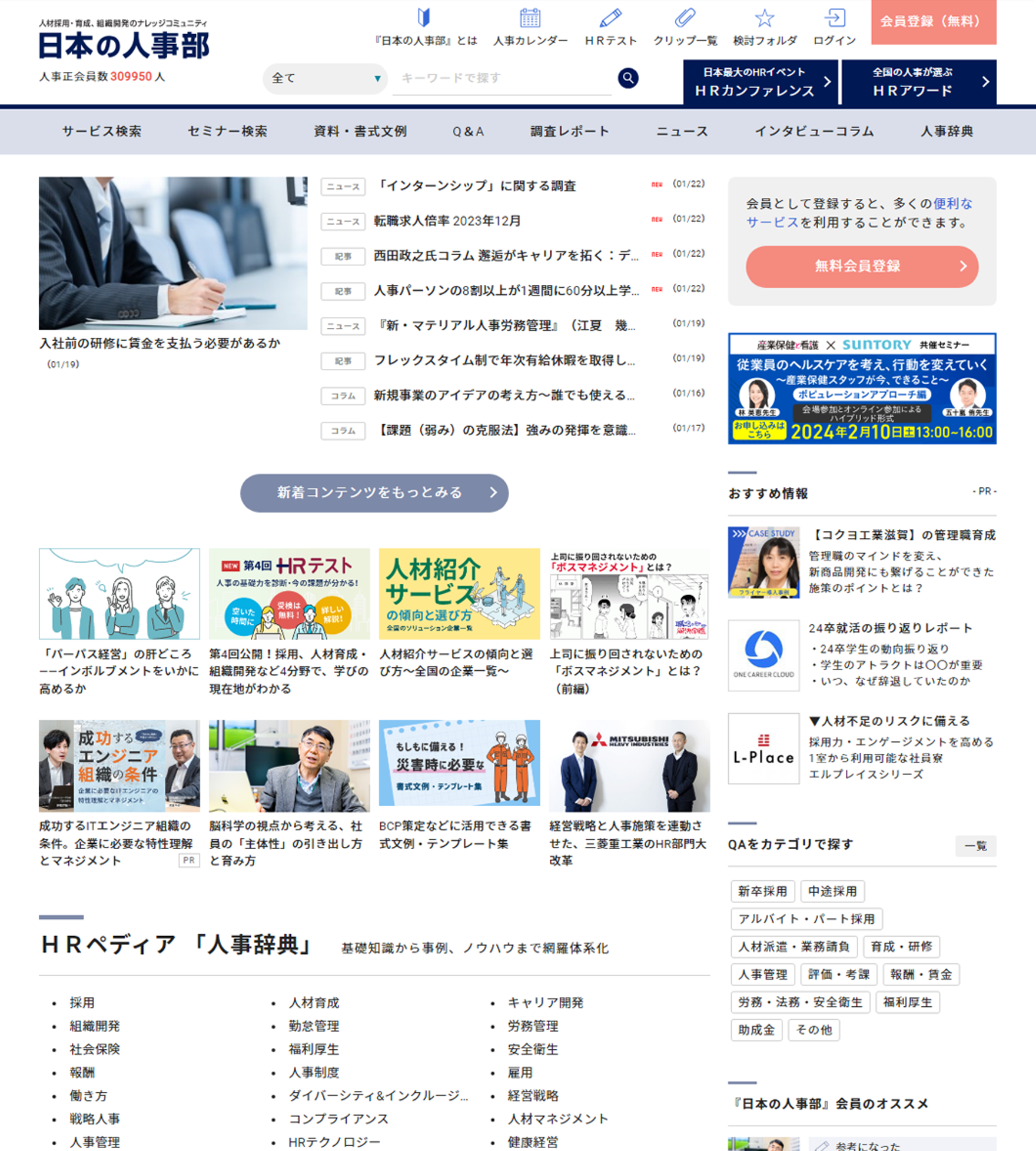 全国の人事や経営者、HRソリューション企業が、組織の枠を超えてつながり、成長する、日本最大級のHRネットワーク『日本の人事部』を運営しています。事業の核となっているポータルサイトは、ヒト・組織に関する役立つ記事を発信するとともに、人材系ソリューション企業に対しては、記事広告やバナー広告、セミナーのご紹介ページなど、さまざまなセールスプロモーション商品をご提案しています。人事や経営者とHRソリューション企業をマッチングする機能が『日本の人事部』の役割の一つです。