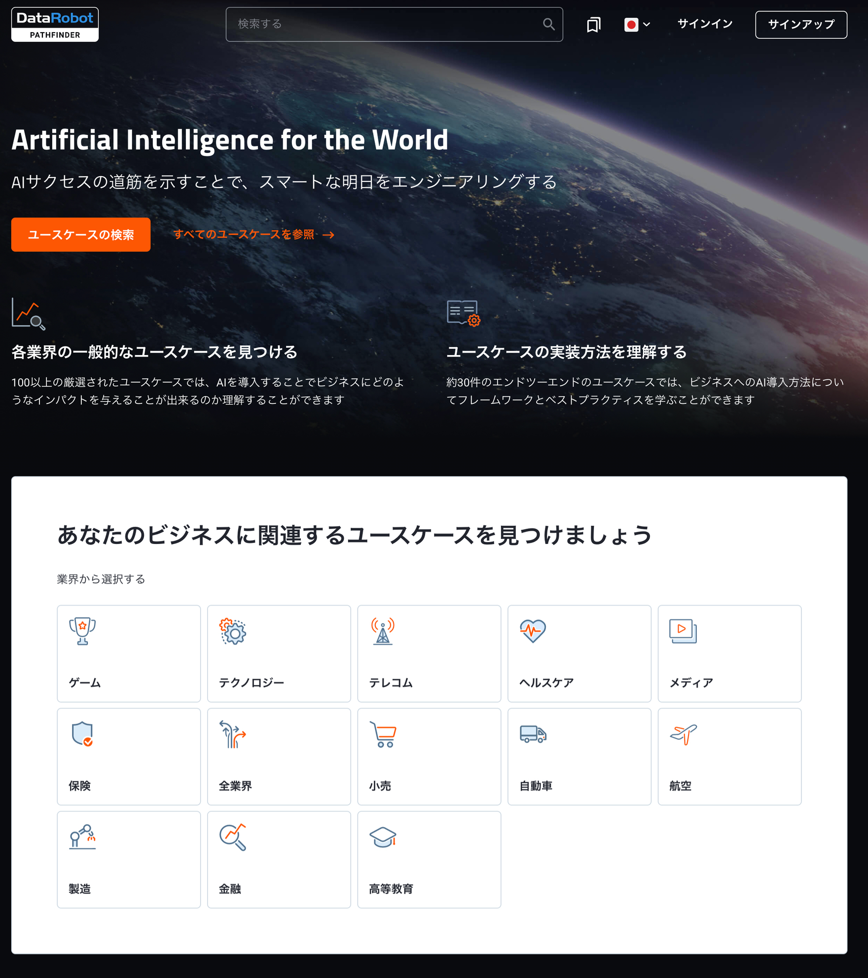「DataRobot Pathfinder(パスファインダー)」は、組織や企業で働くすべての人が、それぞれ独自のビジネスニーズに最も適した AI の活用方法を見つけることができる AI ユースケース(活用方法)の総合ライブラリです。14 の業種で導入実績のある 100 以上の厳選された AI 導入のユースケースを紹介し、AI を使った解決手法を説明しています。これらのユースケースには、需要予測、新規案件のスコアリング、顧客解約率の低減など、様々な業界で参考となる AI 活用に加え、再入院の低減や保険申請の深刻度予測、マネーロンダリングの防止など、特定業界における固有の AI 活用も含まれます。