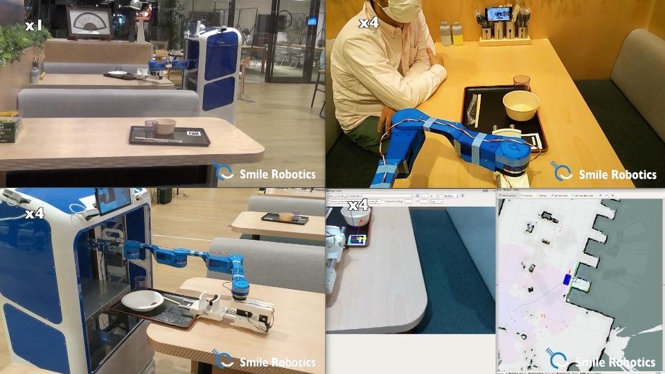 「自律走行型のロボットアーム」であることで、下記のメリットがあります。 ● 店員もお客様も「ロボットとテーブル間の皿の乗せ替え」が不要 ● 自律走行型であり「天井や床のガイド」や「遠隔操作」が不要
