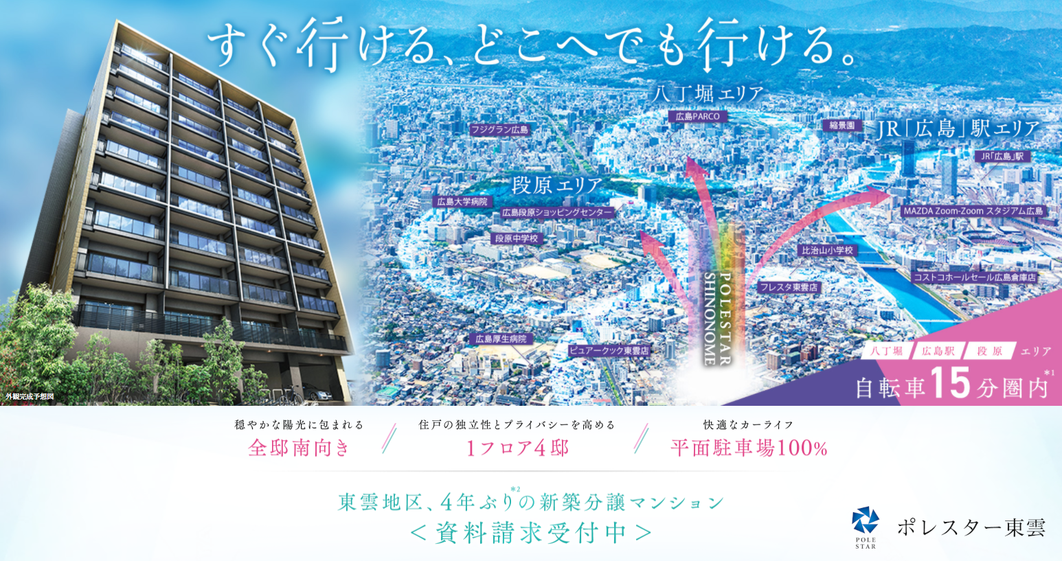広島市南区の新築分譲マンション「ポレスター東雲」。八丁堀、広島駅、段原エリアへ自転車15分圏内のどこへでもすぐ行ける自在ポジション。東雲地区4年ぶりの新築分譲、全邸南向き、1フロア4邸の独立性、平面駐車場100%のレジデンスが誕生。