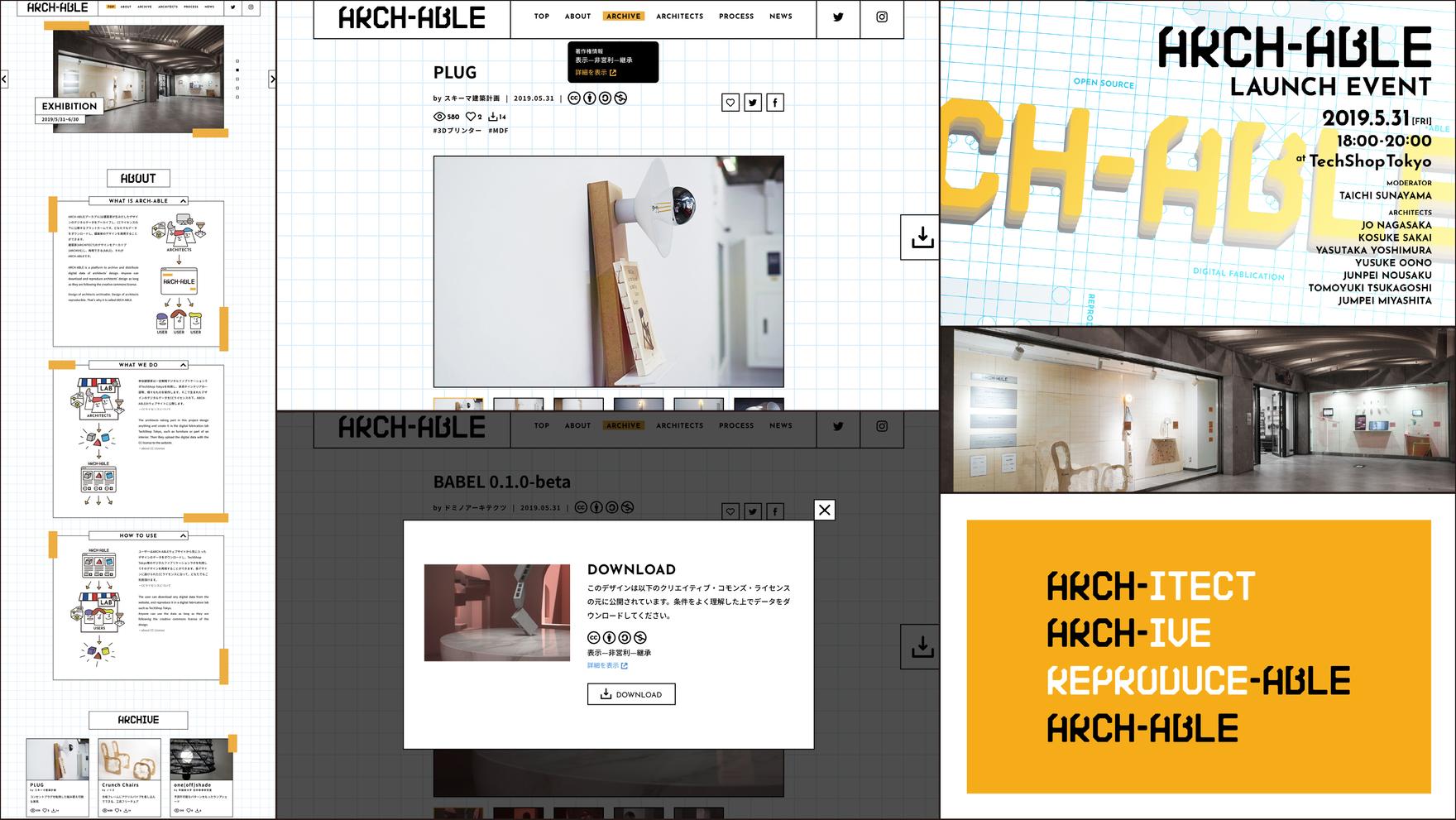 建築家が生みだしたデザインをアーカイブし、CCライセンスの下に公開するプロジェクト・ARCH-ABLE(アーカブル)のコンセプトデザインからVIに至るまで、ブランディングを担当させて頂きました。