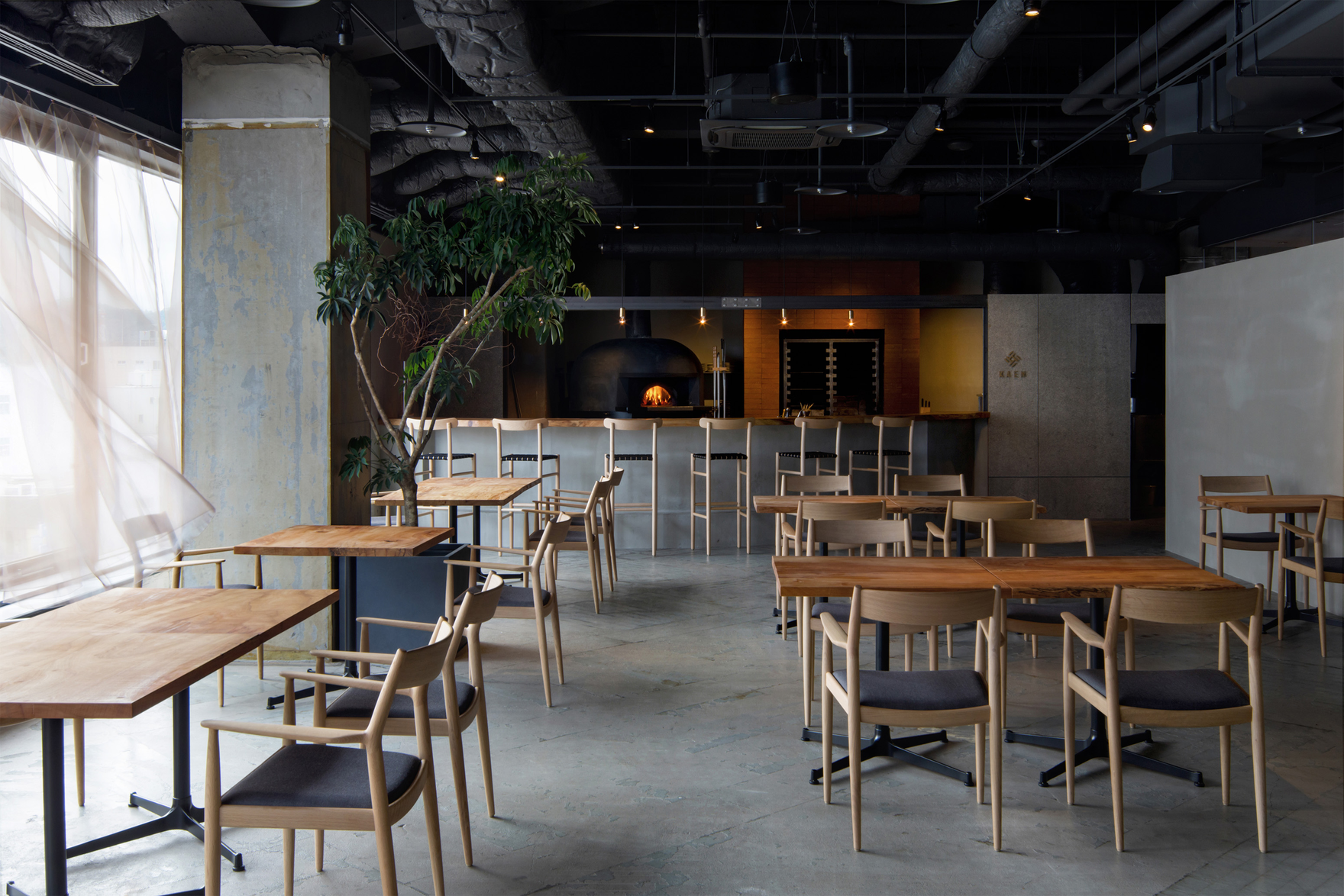 KAENは暖炉と薪窯を使用し、薪の火を熱源とした原始的な調理方で、素材を活かして丁寧に調理するレストランです。ローカルファーストを意識した運営者のこだわりを空間にも落とし込めないかと考えました。新しく作る部分は最小限にとどめ、その中に、鳥取で長年無垢の木を扱ってきた澤太一郎の無垢の木で作ったカウンターとテーブルを配置することで丁寧で温かみのある空間をデザインしました。