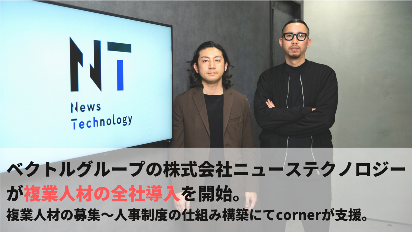 人事・採用のパラレルワーカーシェアリングサービス「corner」を運営する株式会社コーナー(所在地:東京都渋谷区 代表取締役:門馬 貴裕、以下コーナー)は、ベクトルグループの株式会社ニューステクノロジーの複業人材の全社導入にあたり、社内制度やスキーム構築支援を実施したことをお知らせいたします。