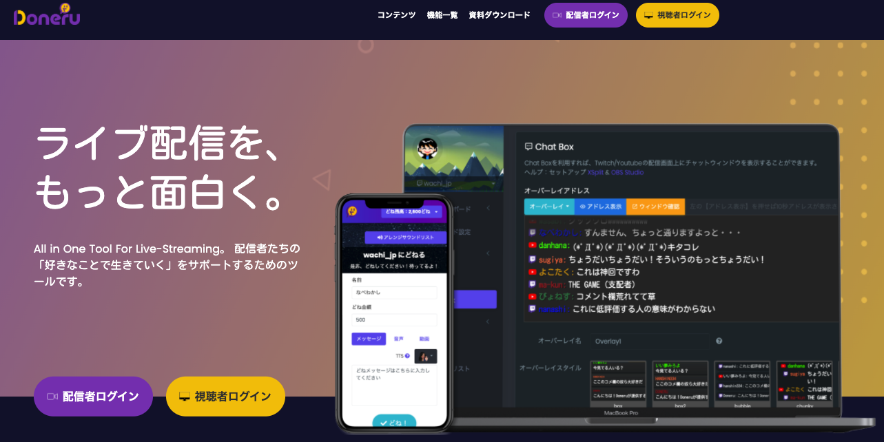 Doneruは配信者・クリエイターのためのライブ配信拡張プラットフォームです。