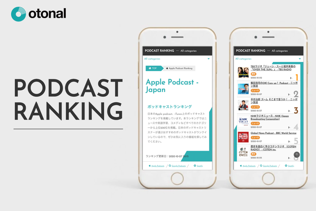 『ポッドキャストランキング』では、Apple Podcastsの人気ランキングを200件、Spotifyは20件、Google Podcastsでは12件をそれぞれ表示しており、国内の人気ポッドキャスト番組をひとつのサイト上で確認することができます。