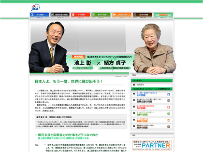 2009年のおよそ半年間、池上彰さんをナビゲーターに起用し、国際協力機構(JICA)が世界で取り組む国際貢献のご紹介を日経ビジネスオンライン(現:日経ビジネス電子版)のタイアップ企画として制作しました。水の問題、復興支援の問題、命の問題、食料の問題、教育の問題、経済の問題、特別対談の全7回にわたる連載を展開。