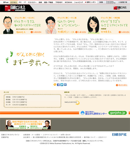 「がんと共に働き、生きる」ことができる社会の実現のために、何をすればいいのか、どう考えればいいのか、企画を通じてとても考えさせられました。第19回(2013年)「日経BP広告賞」優秀デジタル広告賞(タイアップ・経営/社会)を受賞いたしました。
