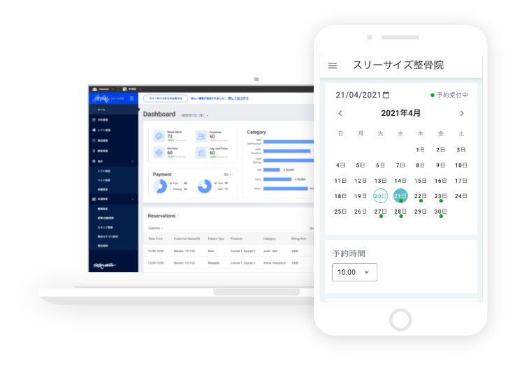 整骨院・鍼灸院・整体院の業界で働く経営者、院長、現場スタッフが監修のもとに開発された業務管理システムです。