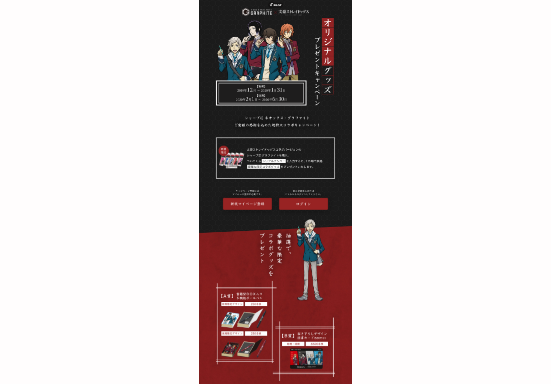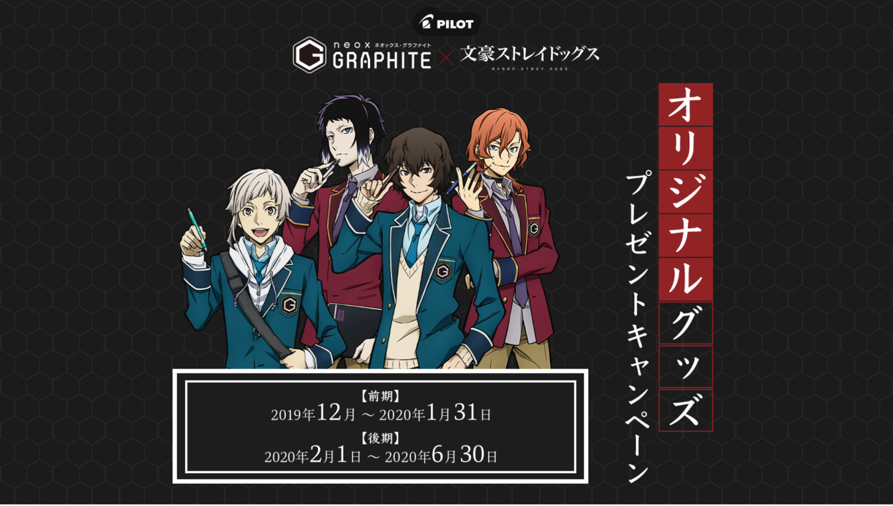 株式会社パイロットコーポレーションが人気TVアニメ「文豪ストレイドッグス」とのタイアップによって行なう『ネオックス・グラファイト×文豪ストレイドッグス コラボキャンペーン』のサイトを制作しました。