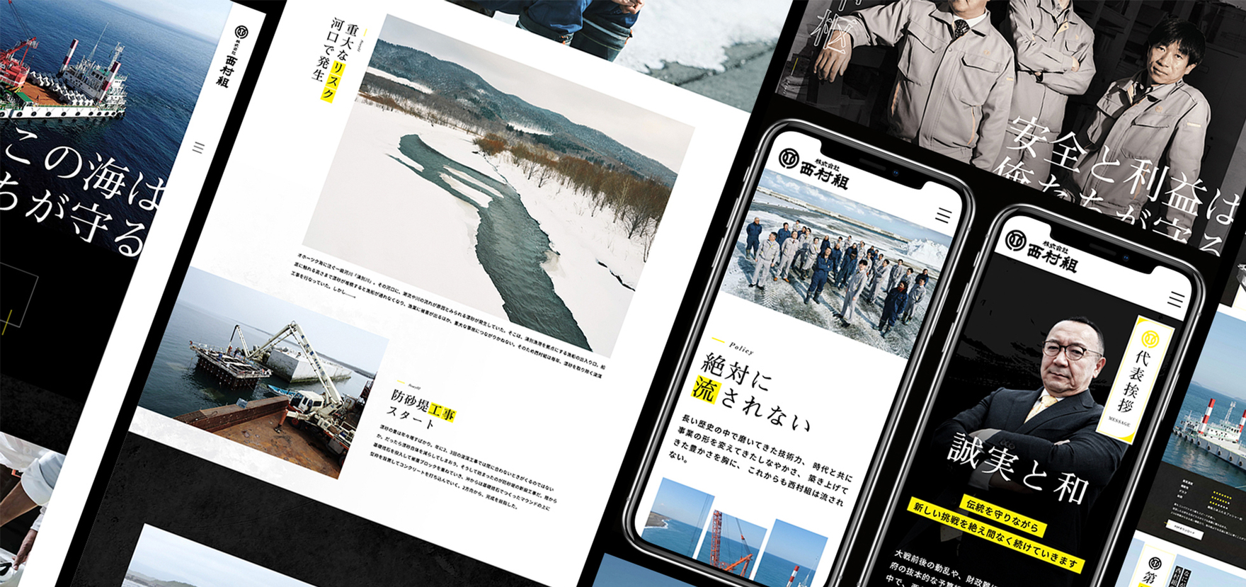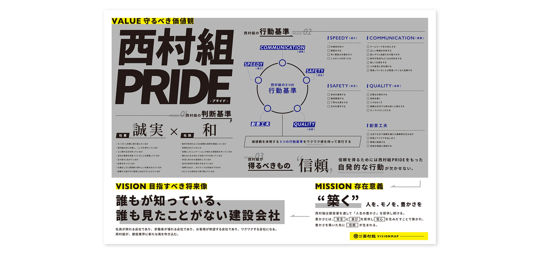 80年以上積み上げてきた歴史やそれを裏打ちする技術力、なにより時代に合わせて挑戦してきた行動力がある西村組。その力強さとしなやかさを表現したコンセプトは「絶対に流されない」。ここから「誰もが知っている、誰も見たことがない建設会社」を社員一丸となって目指していく。