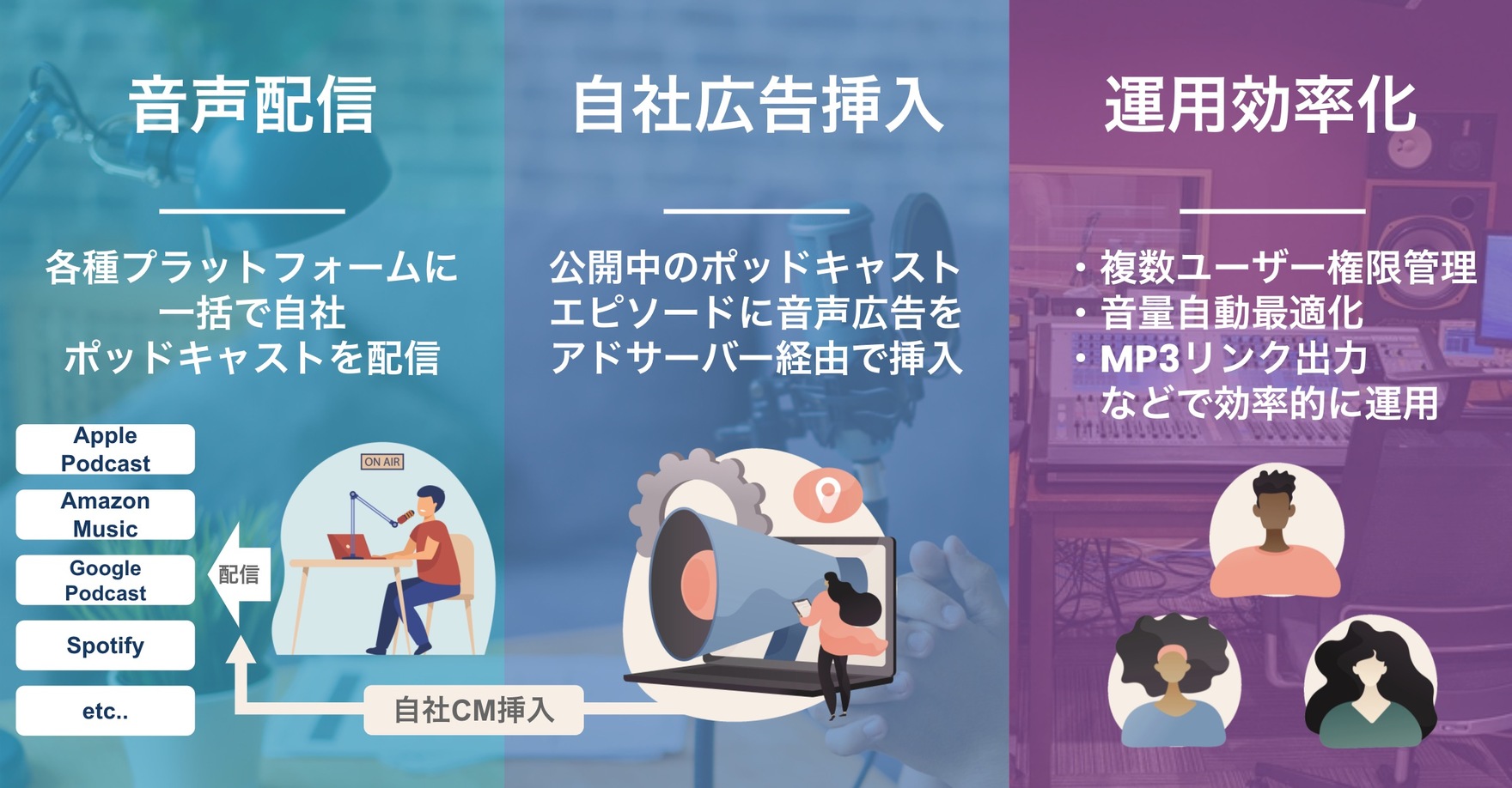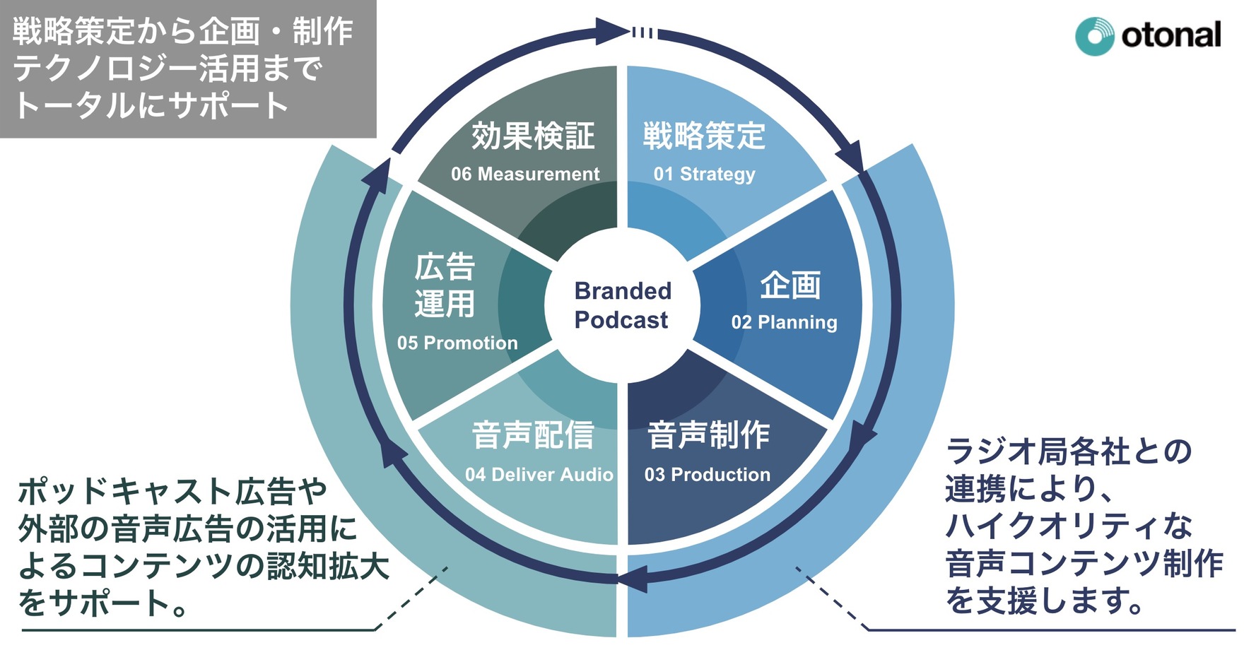 企業のポッドキャスト配信(ブランデッドポッドキャスト)を”音声のオウンドメディア”として活用することで、ブランドのファンや顧客のエンゲージメントを向上し、企業のブランドコミュニケーションを支援する音声配信支援ソリューションです。