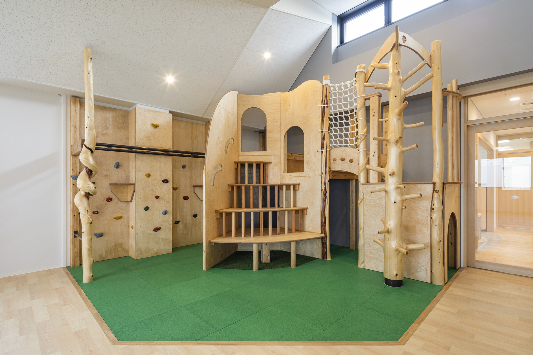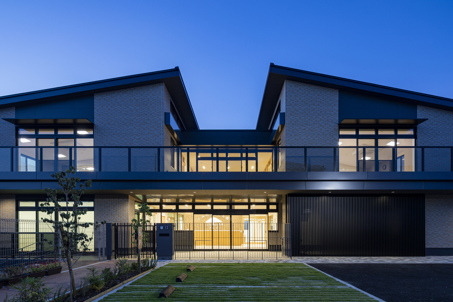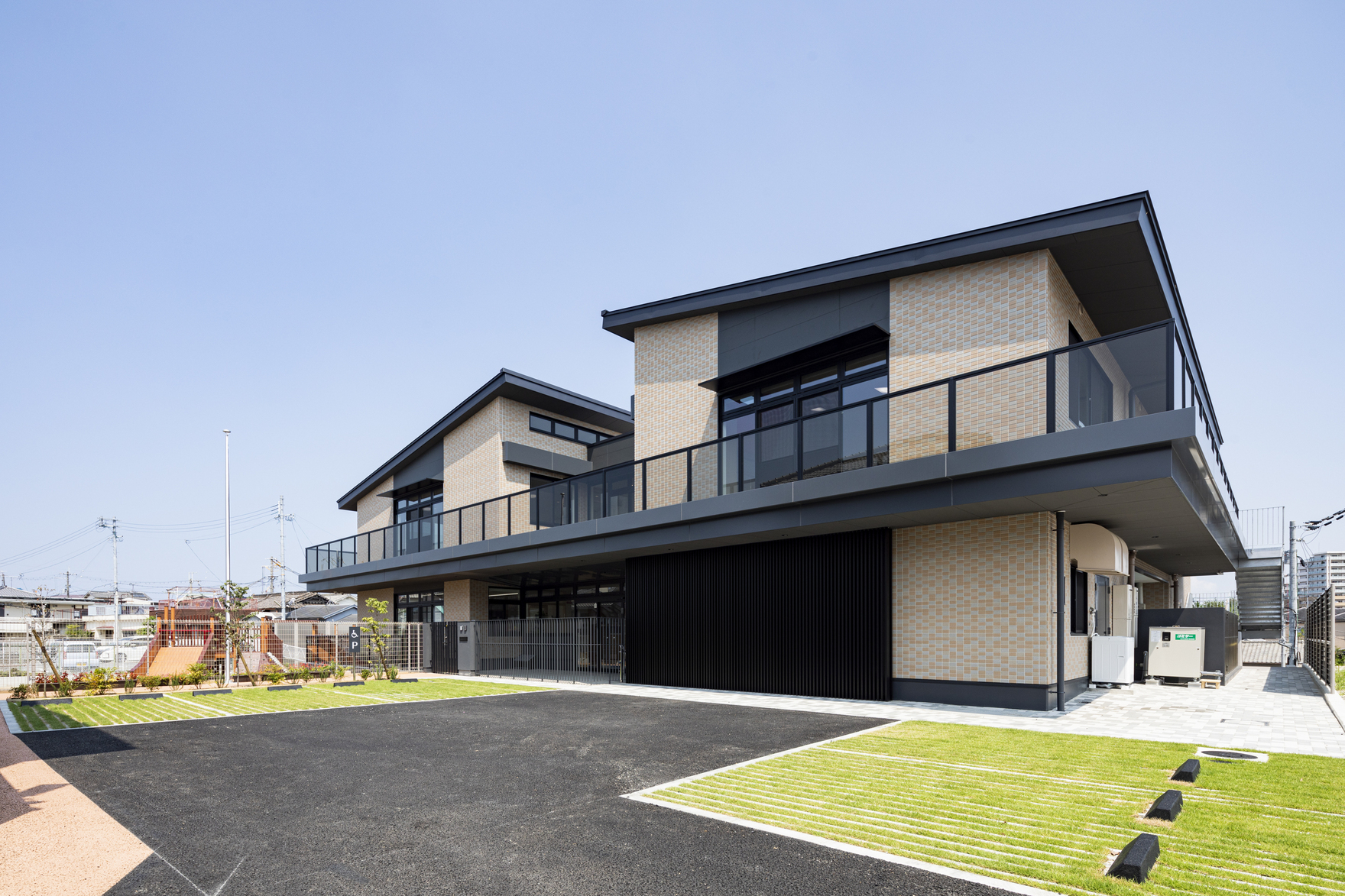 堺市内に立地する幼保連携型認定こども園です。2021年8月より開園。敷地の高低差が大きいことを有効活用できるよう、地階を設け駐車場とし、地上階に各保育室等配置しました。建物周辺は低層住宅が多い事から、本建物ボリュームが近隣へ圧迫感を与えないよう、2階部分のボリュームを分割し勾配屋根を分けて配置する事で、圧迫感の軽減を行いました。内部は建物中央に階段・エレベーター・ホールを配置し、ホールの周りに各保育室を配置する事で、廊下を少なくし合理的な平面計画としました。また、勾配天井となる内部空間には、ハイサイドライトを設け、明るく開放的な室内環境を実現しました。