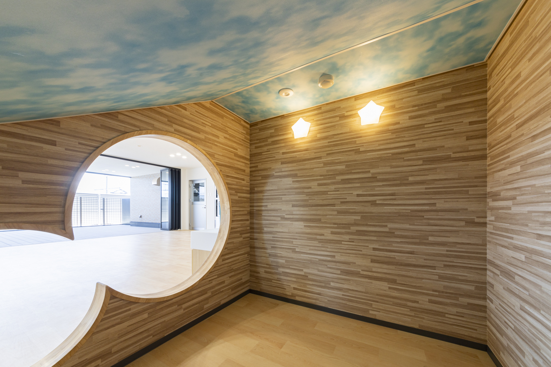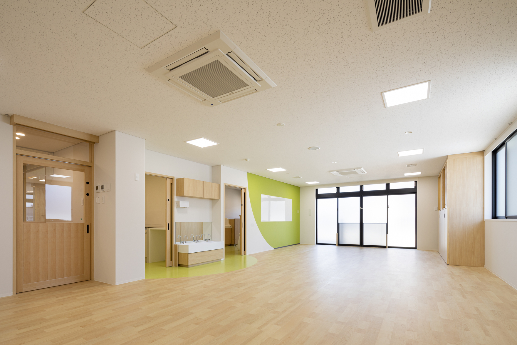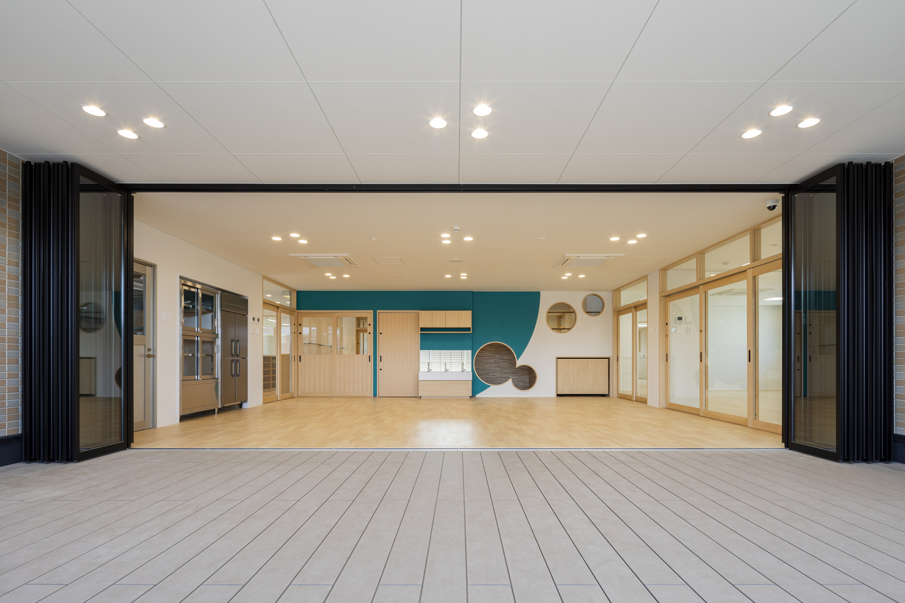 堺市内に立地する幼保連携型認定こども園です。2021年8月より開園。敷地の高低差が大きいことを有効活用できるよう、地階を設け駐車場とし、地上階に各保育室等配置しました。建物周辺は低層住宅が多い事から、本建物ボリュームが近隣へ圧迫感を与えないよう、2階部分のボリュームを分割し勾配屋根を分けて配置する事で、圧迫感の軽減を行いました。内部は建物中央に階段・エレベーター・ホールを配置し、ホールの周りに各保育室を配置する事で、廊下を少なくし合理的な平面計画としました。また、勾配天井となる内部空間には、ハイサイドライトを設け、明るく開放的な室内環境を実現しました。