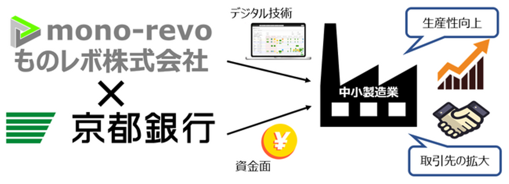 中小製造業のDXを加速するための工程管理アプリ「小ロットスケジューラ」「いきなりIoT」を提供するものレボ株式会社は、2020年11月12日に株式会社京都銀行と業務提携を開始しました。 地元中小製造業の経営課題解決に向けて、資金面から工場業務のデジタル化まで包括的に支援し、地域社会の発展に貢献します。 https://prtimes.jp/main/html/rd/p/000000004.000039351.html