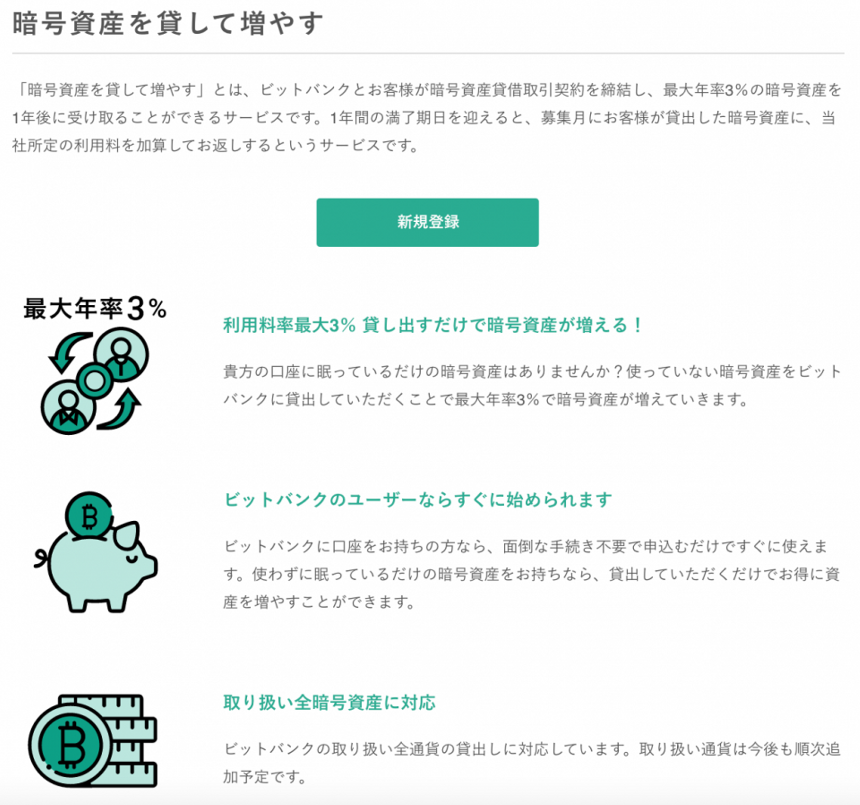 「暗号資産を貸して増やす」とは、ビットバンクとお客様が暗号資産貸借取引契約を締結し、最大年率3%の暗号資産を1年後に受け取ることができるサービスです。