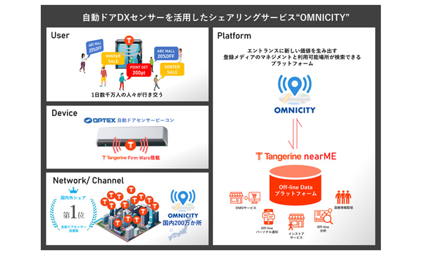 来店時のオフライン行動データの蓄積・分析を通し OMO 施策を提供するオフライン行動データプラットフォーム「Tangerine nearME」が、自動ドアセンサートップシェアのオプテックス株式会社(本社:滋賀県大津市、代表取締役社長:上村 透、以下「オプテックス」)が BLE ビーコン(*1)機能搭載の自動ドアセンサーを活用した新サービス提「OMNICITY サービス(以下オムニシティ)」とサービス連携したことを発表いたします。また、タンジェリンはオムニシティサービス構築にかかるビーコン・クラウド連携技術支援も提供いたしました。