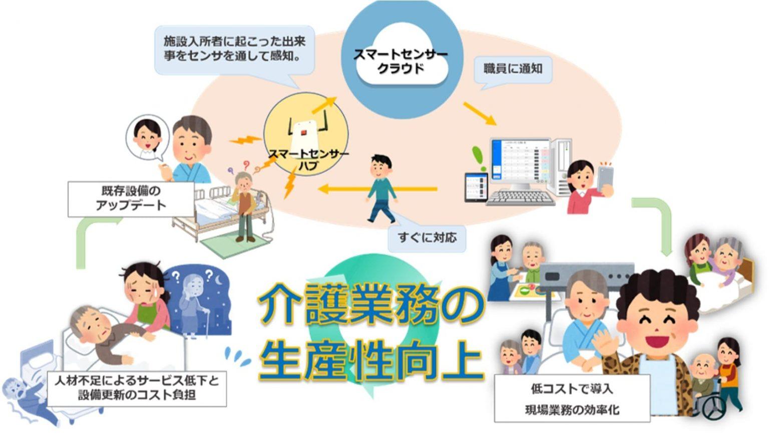 「マゴノテ」は、ナースコールや離床センサなどからの通知を束ねて、入居者の状態を一元管理するシステムです。無線タグ技術を活用した徘徊の検知と迅速対応が可能となっております。IoT用の通信網を採用し、通信コストにも配慮しました。操作をシンプルに抑えながら、ナースコールに実用的な機能を付加しております。例えば、呼び出し機能だけでなく「誤操作による呼び出しの取り消し」「対応開始・完了のボタン操作だけによる報告」などの機能を搭載しております。