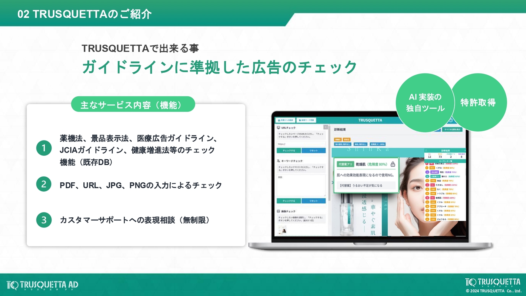 AIチェックツール『TRUSQUETTA』は、薬機法・景品表示法・健康増進法・医療広告ガイドライン・JCIAガイドラインに特化した誇大表現になる恐れがある箇所をぱっと指摘してくれるサービスです。