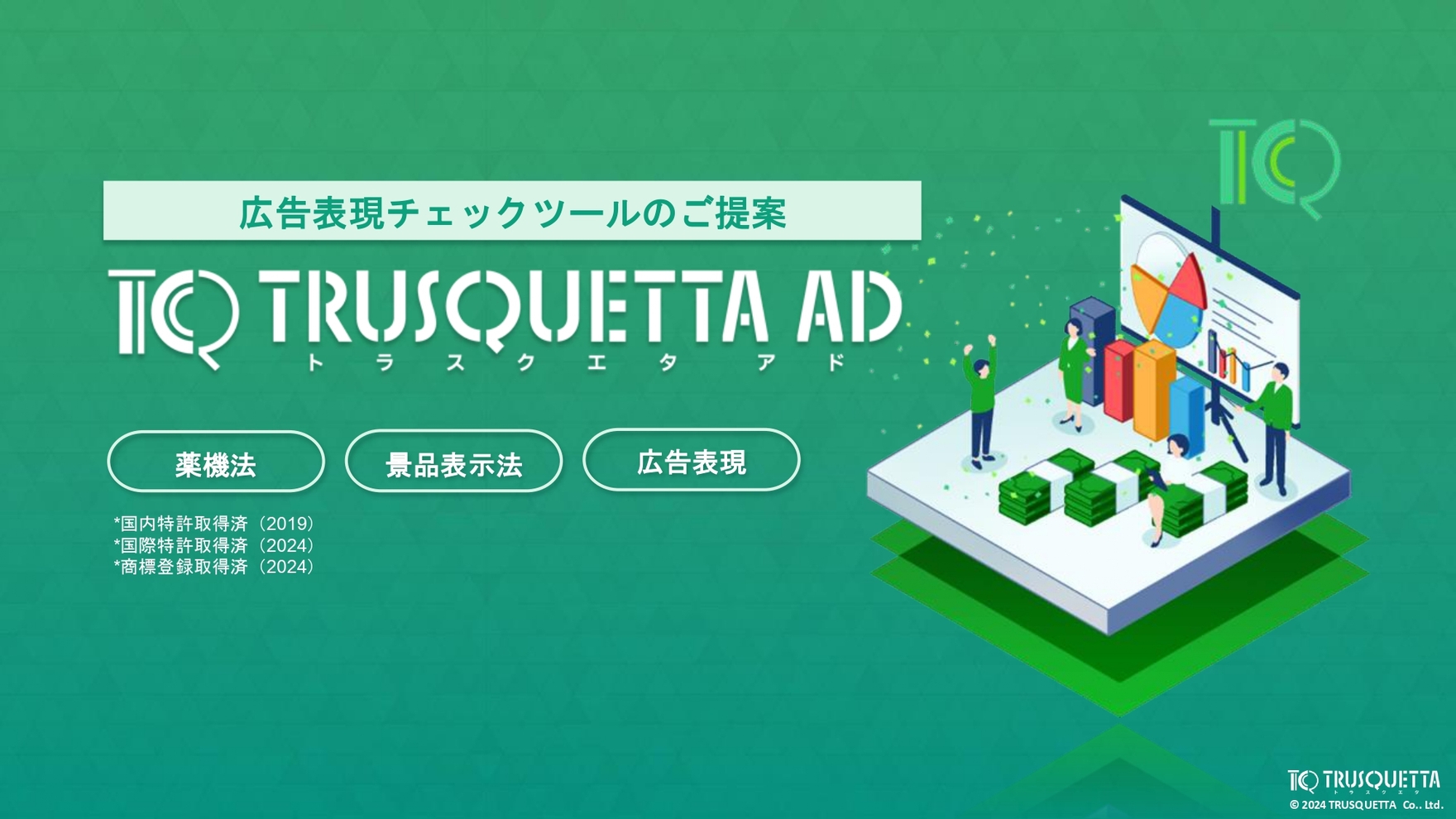 弊社は6年以上かけて広告表現のOKワードとNGワードを4,000語以上蓄積し、2019年に広告文章チェックデータサービス『トラスクエタ』を構築、弊社のオンリーワンサービスとして特許を取得しました。