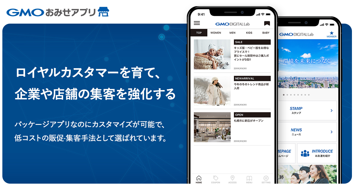 「GMOおみせアプリ」は、さまざまな集客・販促手段を「電子化」し、マーケティングコストの削減とパーソナライズされた顧客コミュニケーションを実現する店舗集客アプリ作成サービスです。全国2,800社・8,000店舗の導入実績(※3)があり、企業や店舗が抱える課題解決やロイヤルカスタマーの育成、集客強化に活用されています。