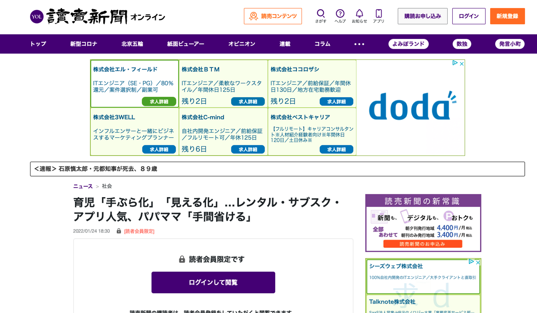 2022年1月24日に読売新聞東京版と読売新聞オンラインにて “育児「手ぶら化」「見える化」…レンタル・サブスク・アプリ人気、パパママ「手間省ける」” の見出しでBABY JOBが提供する手ぶら登園サービスが紹介されました。