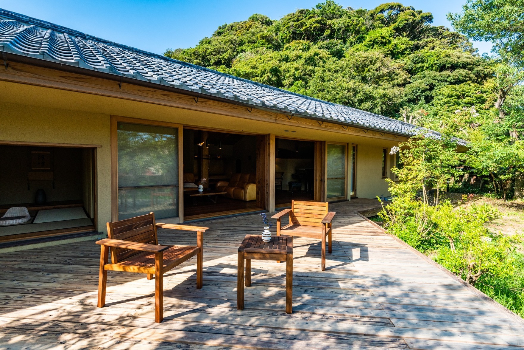 敷地内には、広大なウッドデッキテラスや、心落ち着かせる素敵なお庭があり、優雅な時間を過ごすことができます。