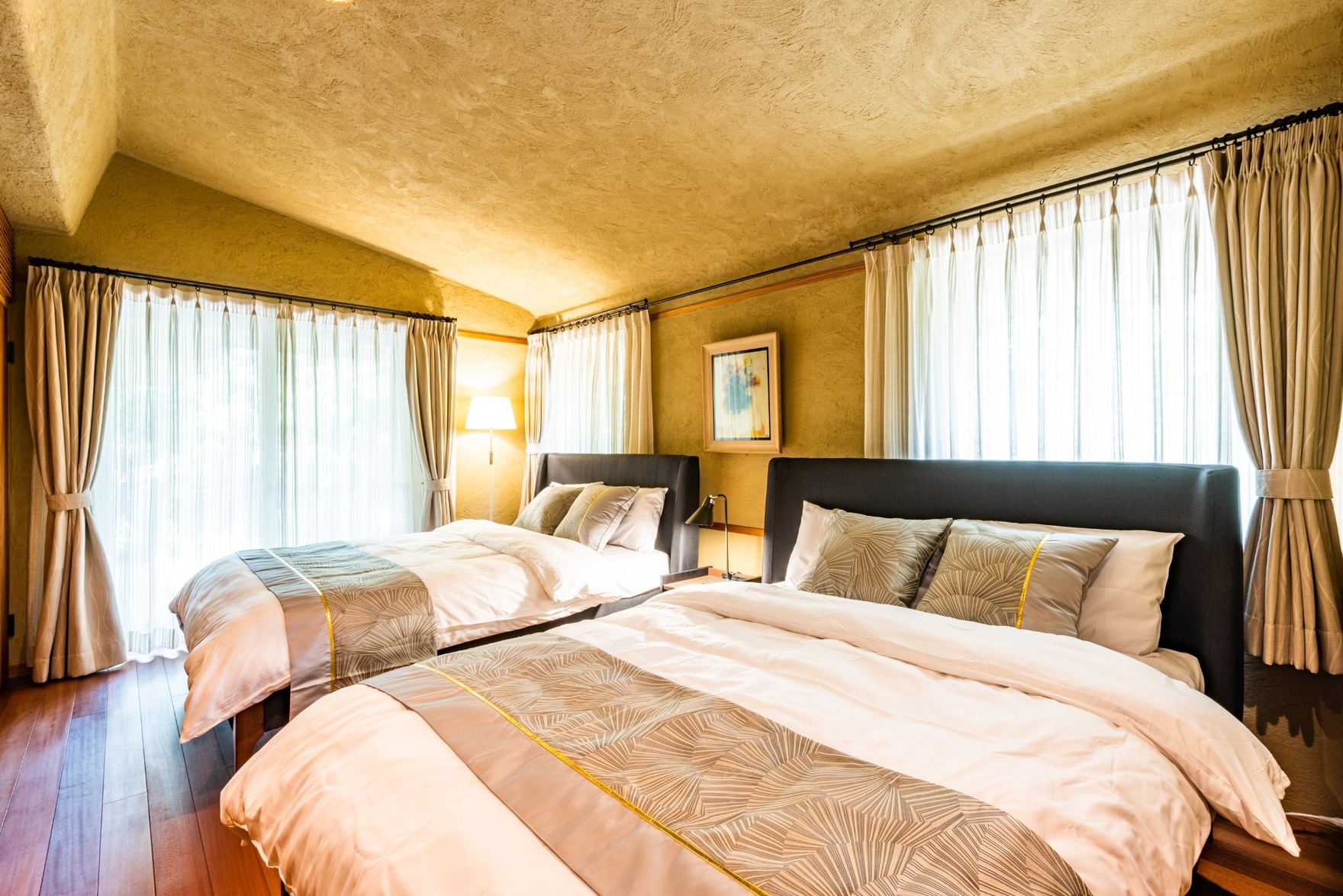 3つの寝室に最大で8名様が宿泊できるようなゆとりある空間設計や、駐車場を完備して観光に出かけやすい点などがお客様からご好評のお部屋です。
