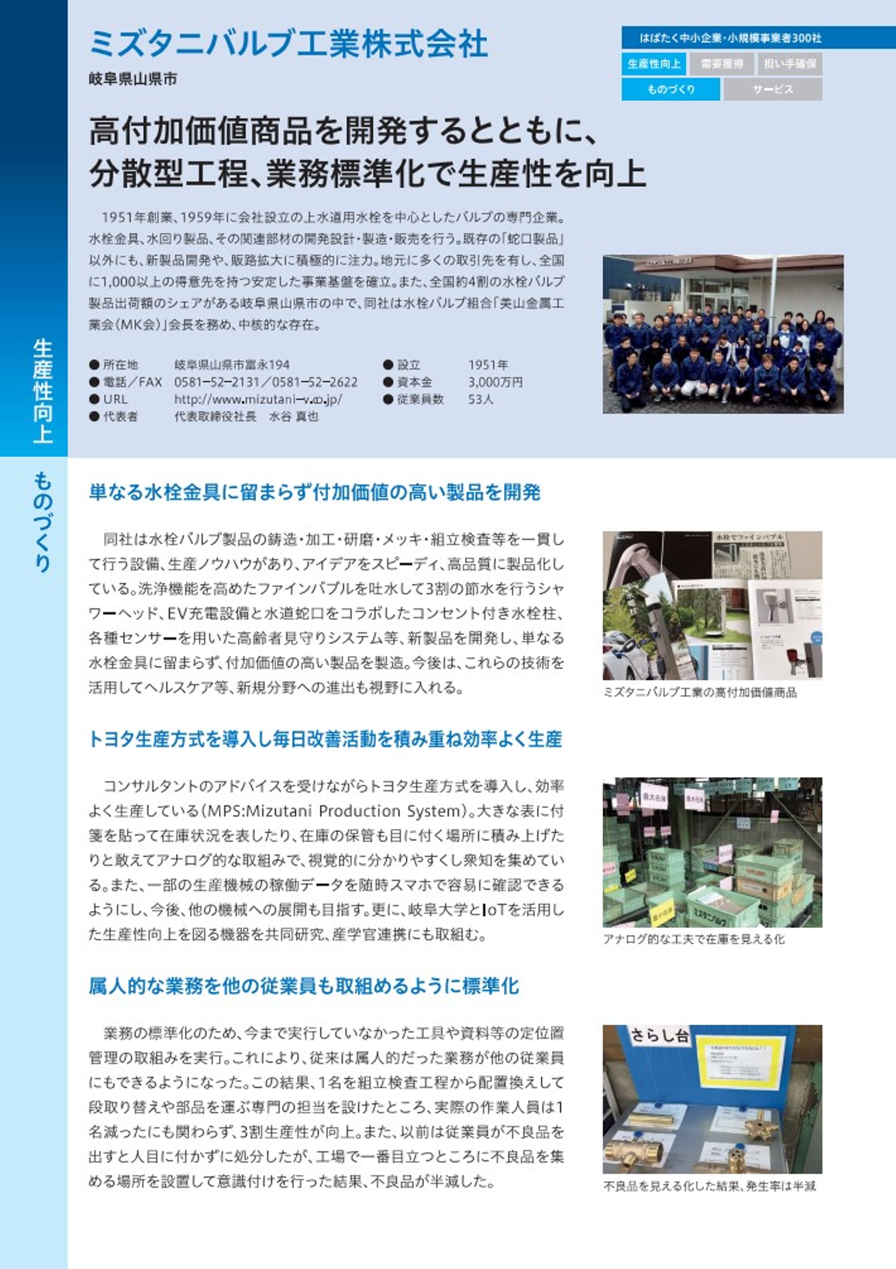 常日頃の改善活動が実を結び、生産性向上の項目で経済産業省・中小企業庁から「はばたく中小企業・小規模事業者300社:2019」に選定していただきました。まだ2019年にはMPS=Mizutani Production System(ミズタニ生産方式)と呼んでいましたが、現在は改善活動が作業改善のみにとどまらないために呼び名が変わり、MPS=Mizutani Project Structure(ミズタニ事業構造活動)に変化しました。