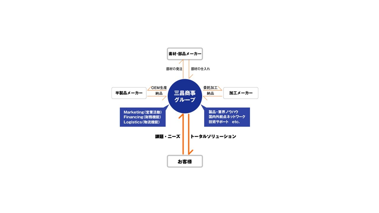 多彩なメーカー群と商品ラインアップを持ち、豊富な商品知識と技術情報を提供することにより、国内外のお客様からビジネスパートナーとして認められています。三昌商事の強みは、機動性の高い小規模物流。大手商社が自社コンピュータシステムの駆使と巨大物流倉庫や運送手段を持つのとは異なるスタンスを築き、単品材料・部品販売にとどまらず、構成部材一括物流或いは加工委託物流等、新しい価値創造にも貢献しています。