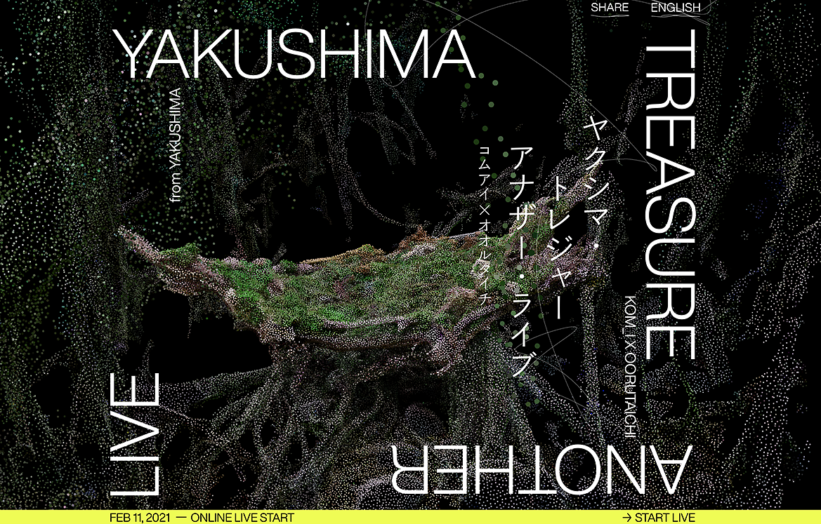 コムアイとオオルタイチによるプロジェクト“YAKUSHIMA TREASURE”、クリエーティブハウス“Dentsu Craft Tokyo”、映像作家・辻川幸一郎のコラボレーションによる作品「YAKUSHIMA TREASURE ANOTHER LIVE from YAKUSHIMA」。 “YAKUSHIMA TREASURE”による屋久島の原生林「ガジュマルの森」で行った最新のライブパフォーマンスを、ウェブブラウザを通してインタラクティブに視聴できる作品です。