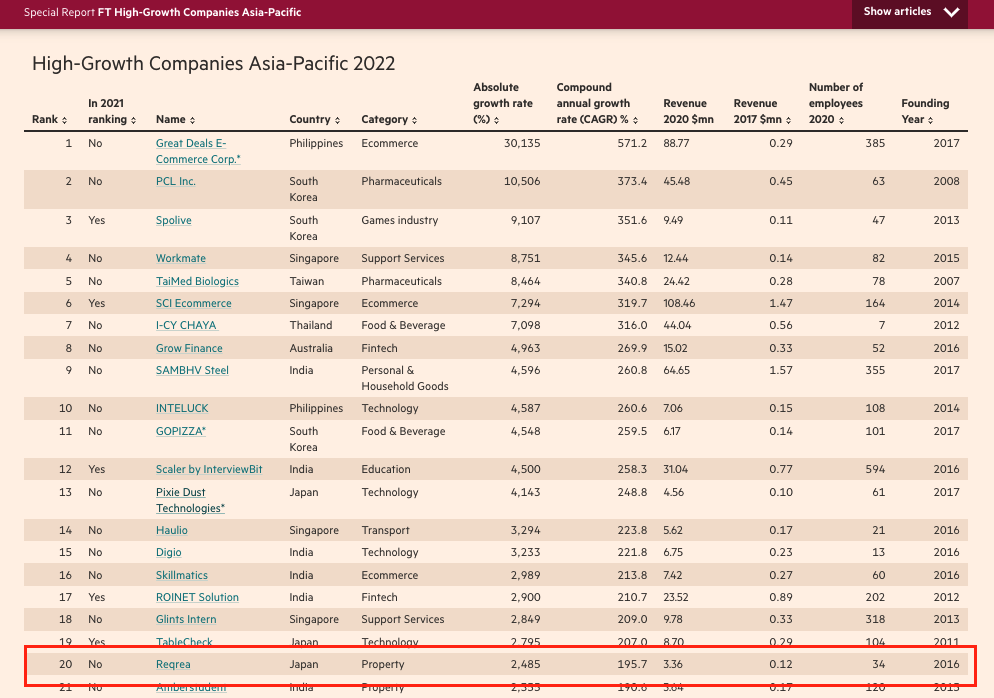 リクリエは、この度、Financial Times社(本社:ロンドン、以下「Financial Times」)とStatista社(本社:ハンブルグ、以下「Statista」)が共同で調査を行った「High-Growth Companies Asia-Pacific 2022(アジア太平洋地域における急成長企業ランキング)」において総合20位(不動産業界1位)にランクインいたしましたので、その旨ご報告させていただきます。