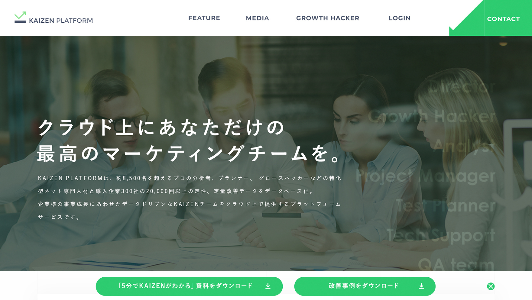 デジタルマーケティングを強みとする株式会社Kaizen Platformが、Webサイトの改善グロースハックサービスとして提供している『Kaizen Platform』のサービスサイト・メディアサイトをデザインさせていただきました。