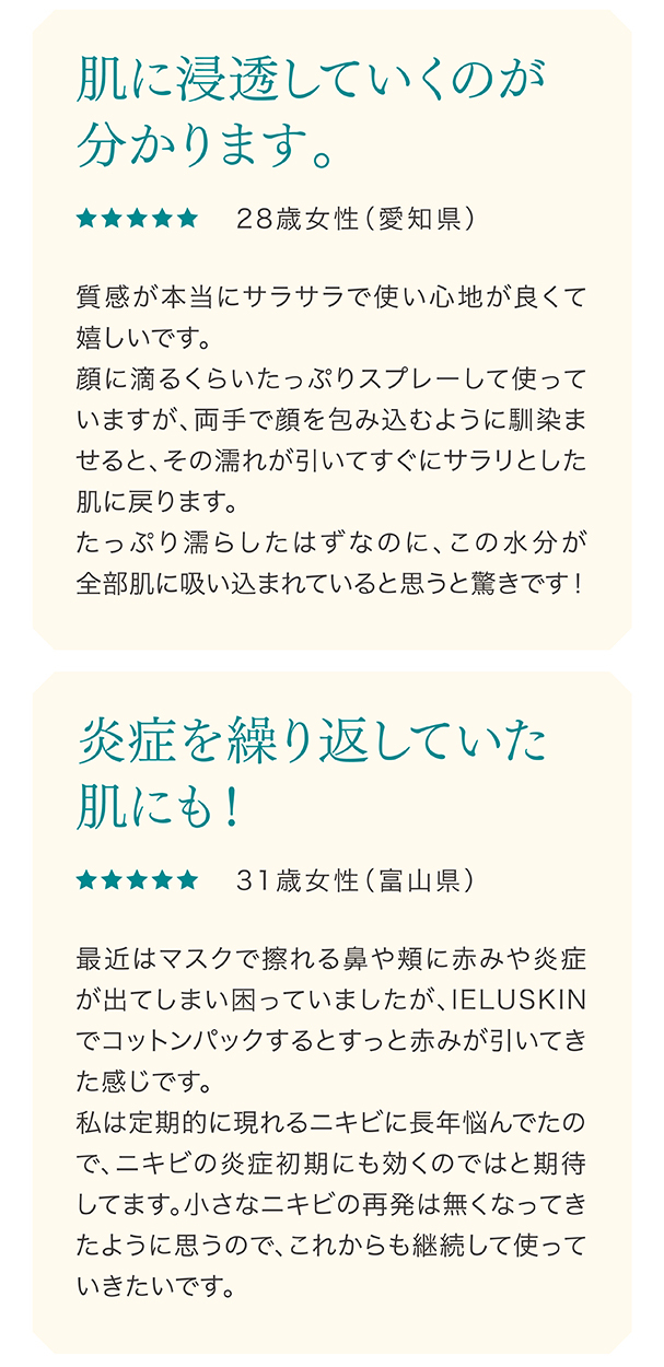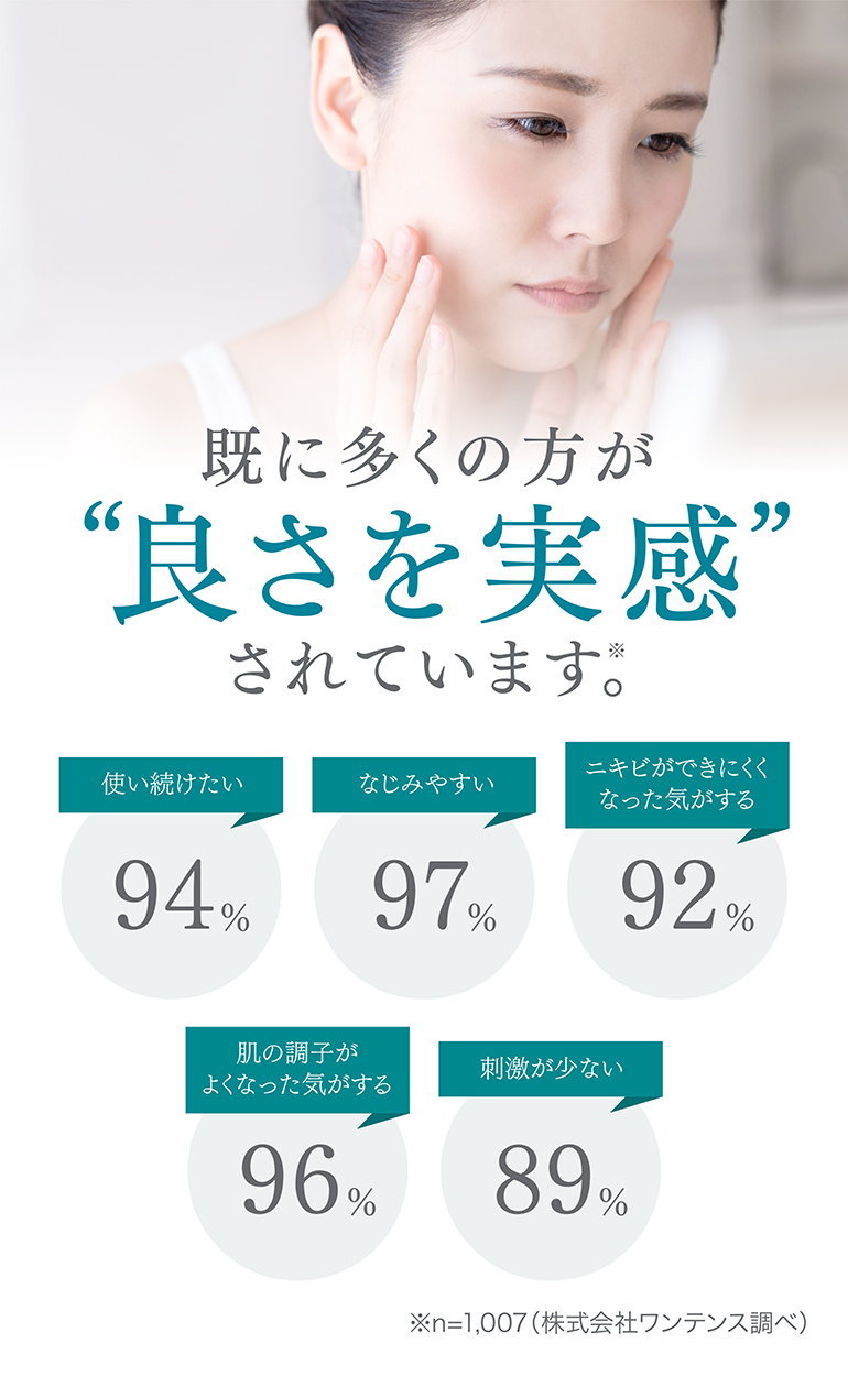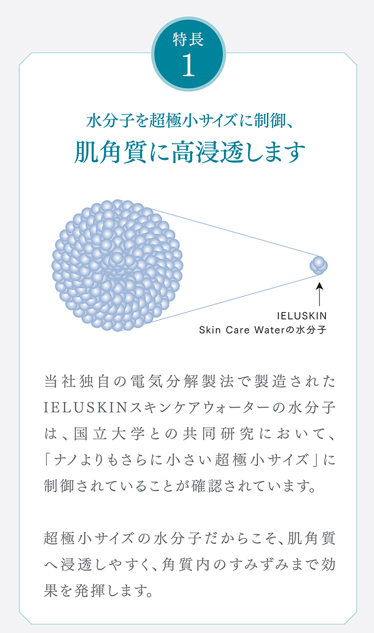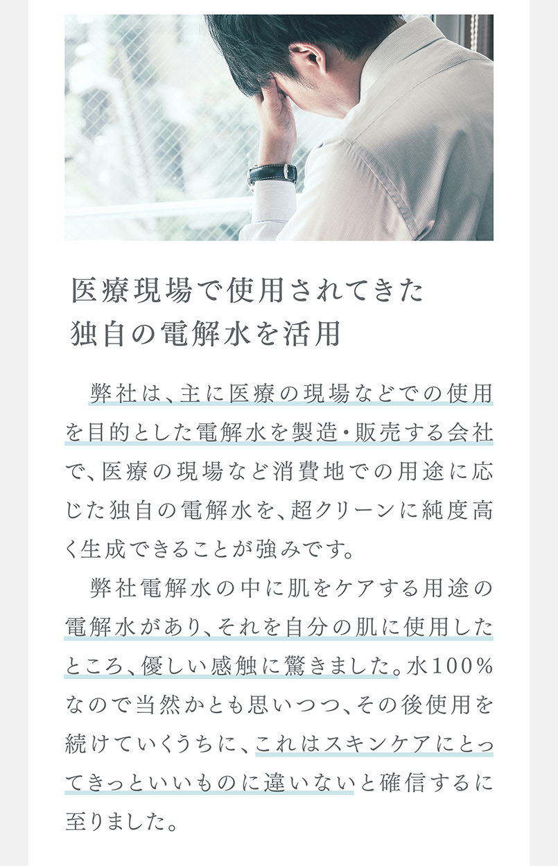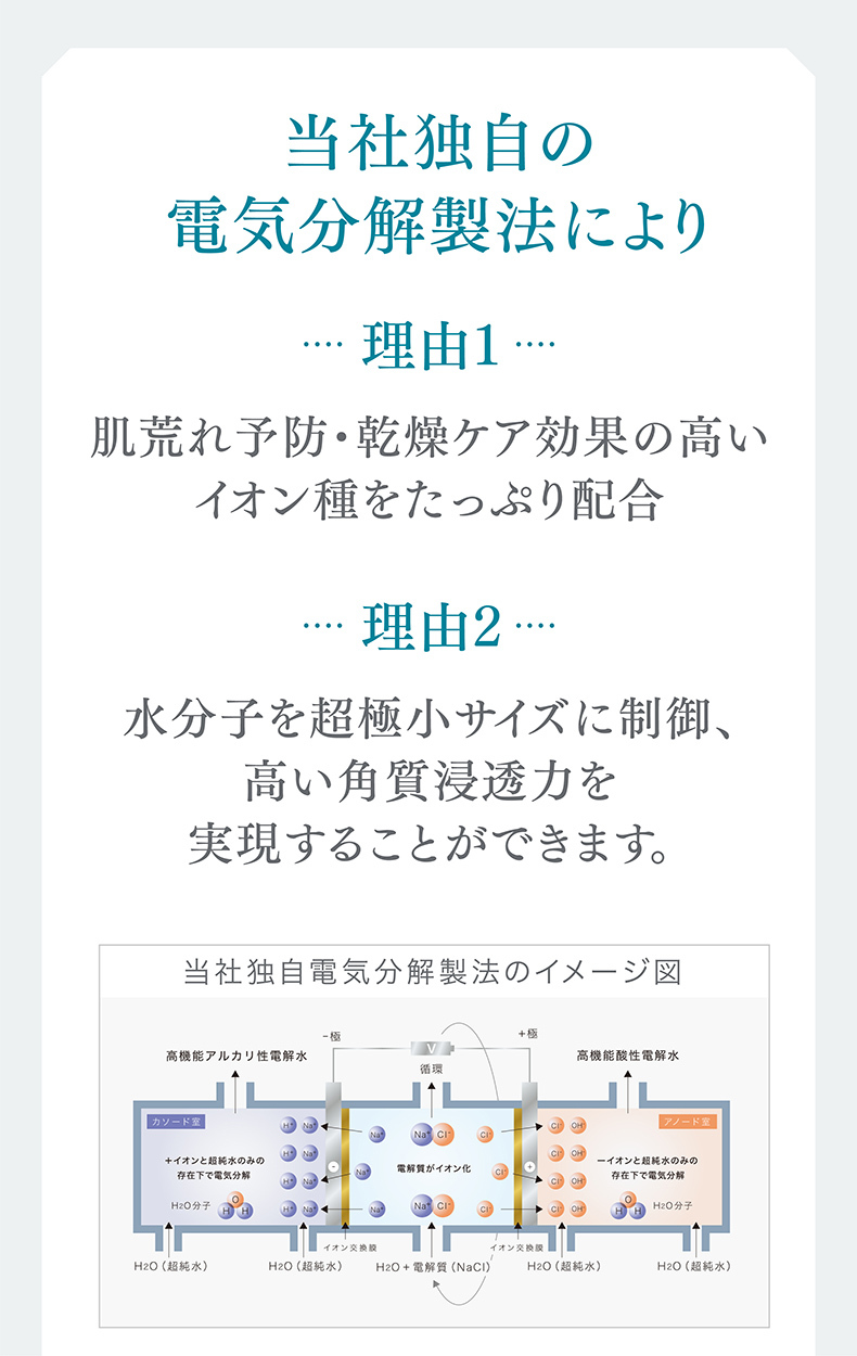 当社独自の電気分解製法により、①肌荒れ予防・乾燥ケア効果の高いイオン種をたっぷり配合し、②水分子を超極小サイズに制御し高い角質浸透力を、実現した電解水100%の、肌荒れ特化型化粧水です。マスク荒れなど、肌荒れ部分にたっぷりと塗布してください。接着時間が長いほど効果があり、1週間使い続けて頂ければ、実感できるという声を多く頂戴しています。